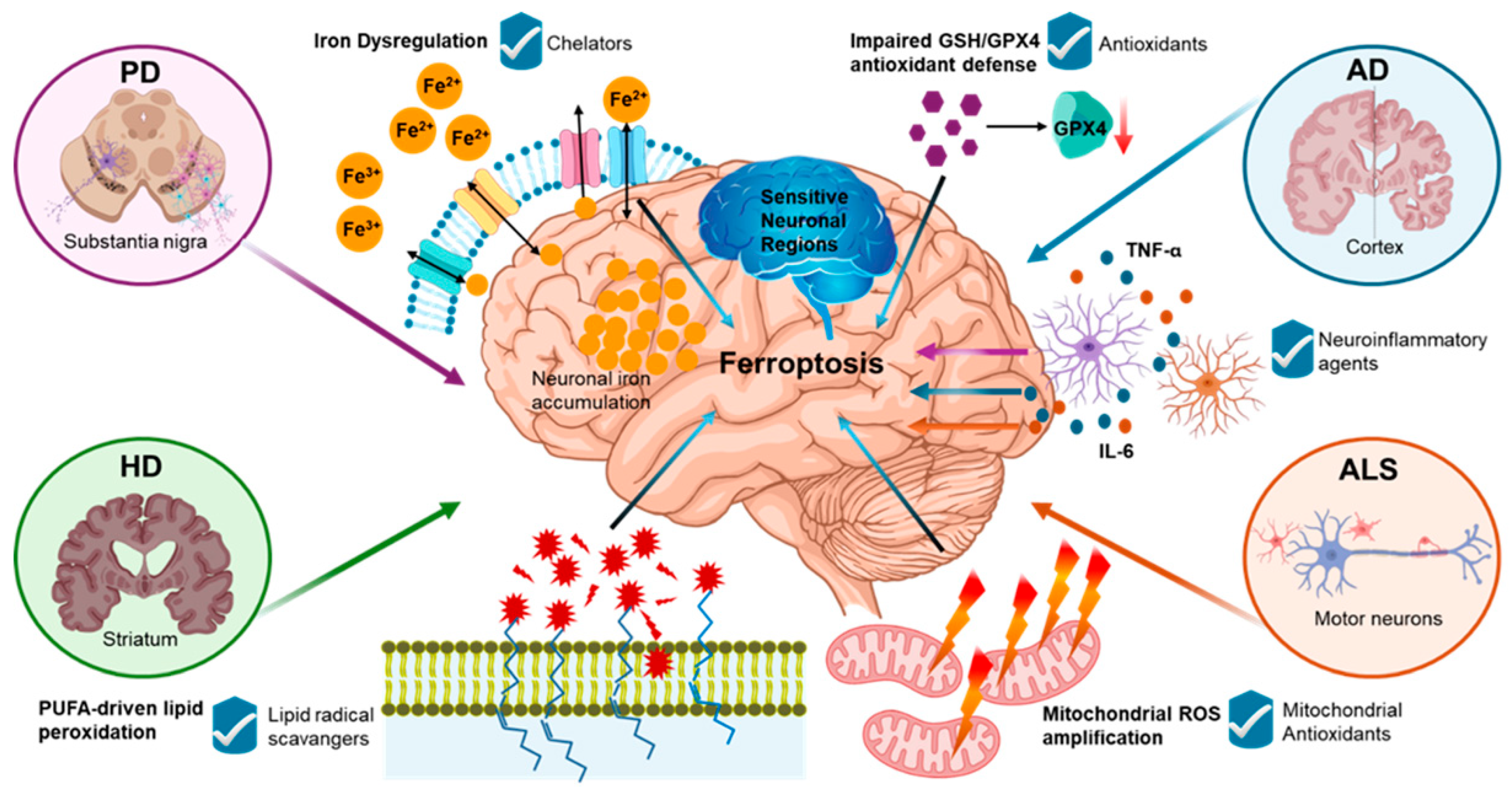 - Yi, Y.; Jia, P.; Xie, P.; Peng, X.; Zhu, X.; Yin, S.; Luo, Y.; Deng, Y.; Wan, L. Beyond oxidative stress: Ferroptosis as a novel orchestrator in neurodegenerative disorders. Front. Immunol. 2025, 16, 1683876. [Google Scholar] [CrossRef]