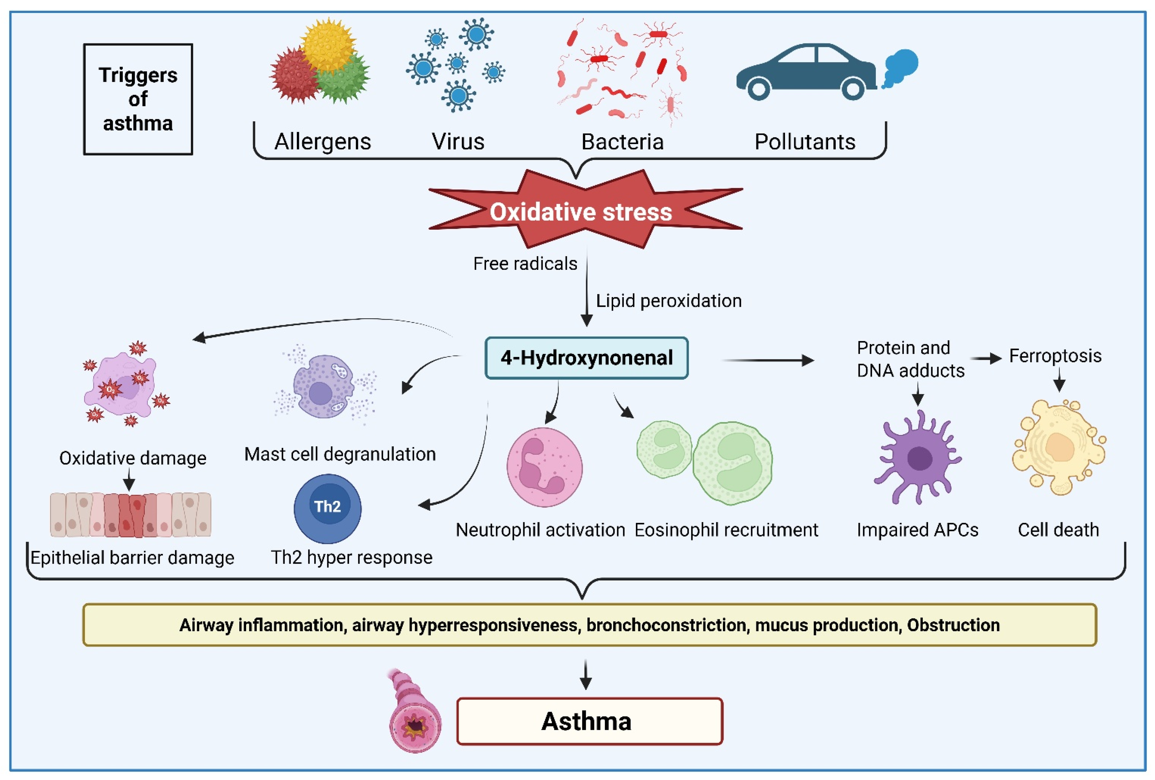 | Asthma | Exhaled breath condensate, sputum (Humans) | Increased 4-HNE and other lipid aldehydes | Reflects airway oxidative stress and inflammation | [47] |