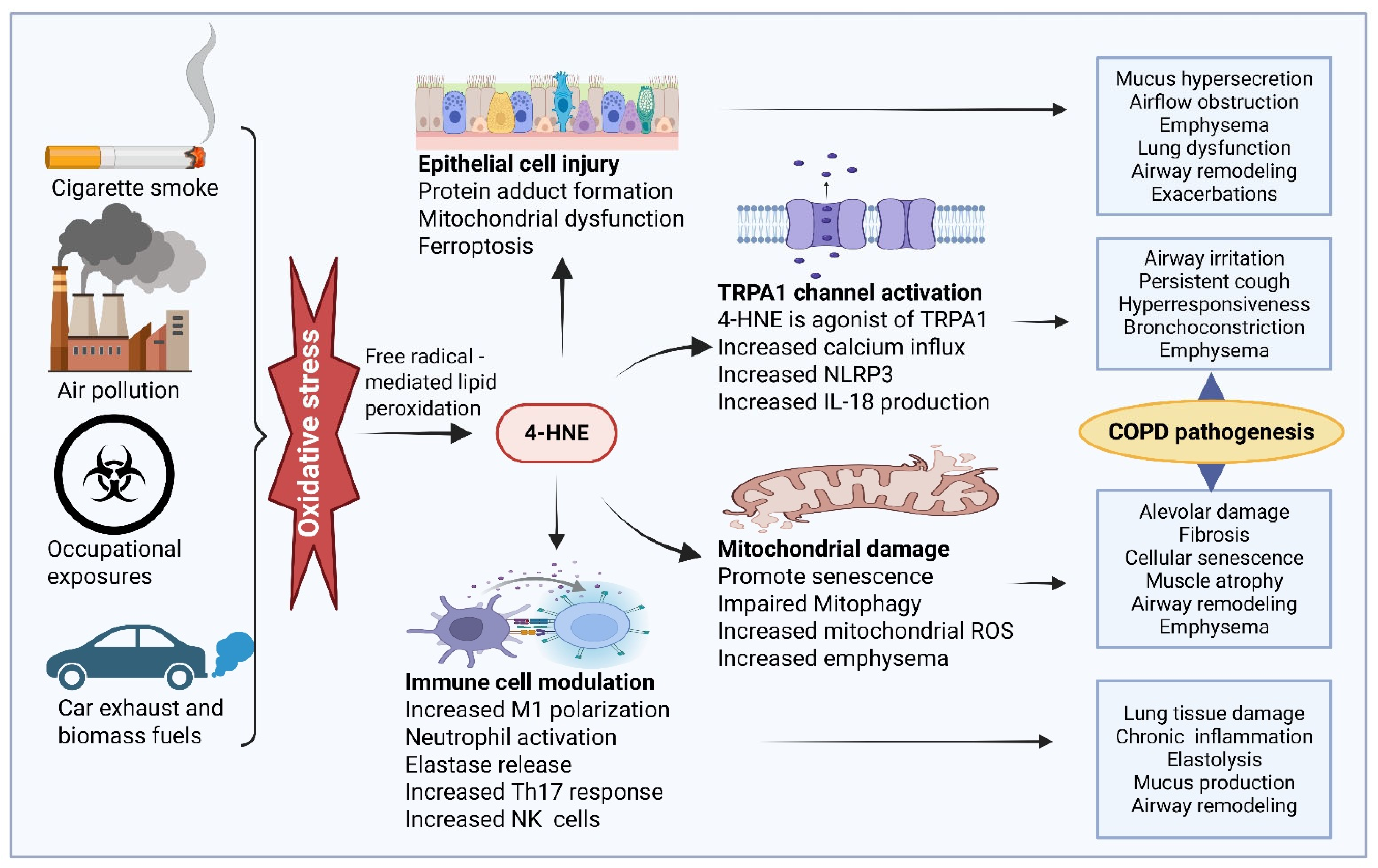 | Cigarette smoke models (Animals) | Increased 4-HNE linked to mitochondrial damage | Marker of disease progression | [73,74,75,76,77,78] | |
