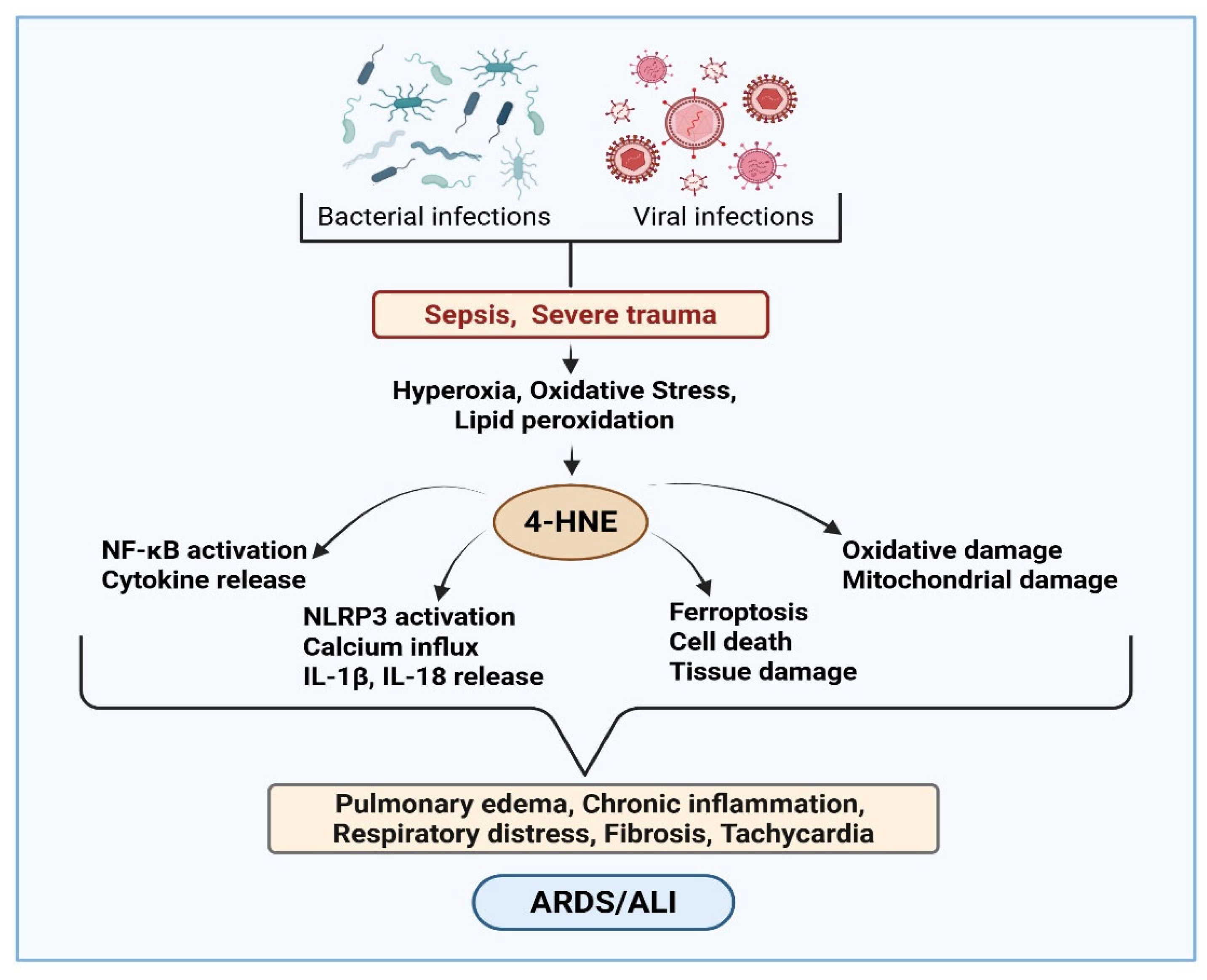 | ARDS/ALI | Plasma, lung tissue (Animals; sepsis models) | Increased 4-HNE associated with oxidative lung injury | Marker of lipid peroxidation | [105,106,107,108] |