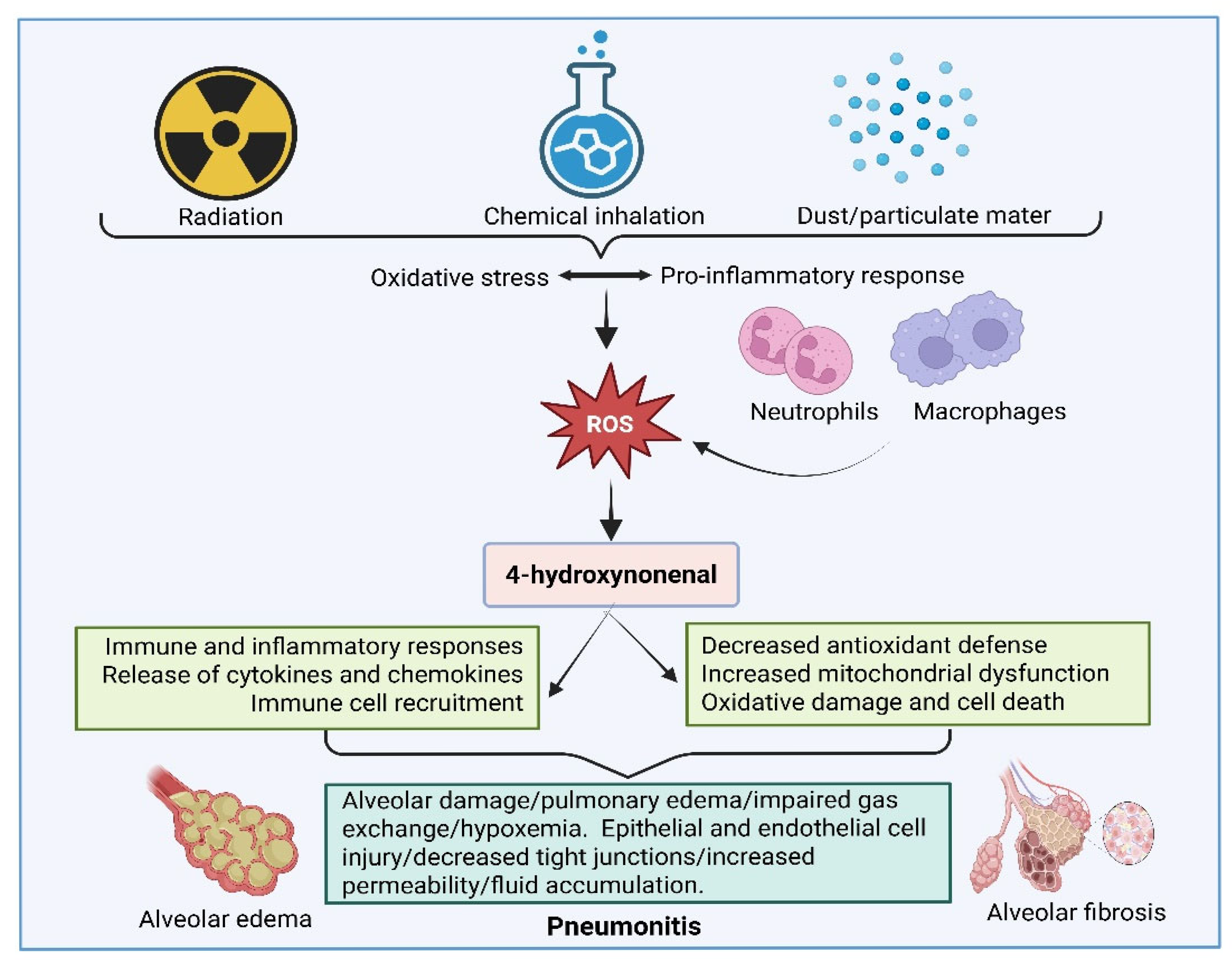 | Pneum-onitis | Lung tissue (Radiation models; Animals) | Increased lipid peroxidation and 4-HNE | Marker of oxidative membrane damage | [129,130] |