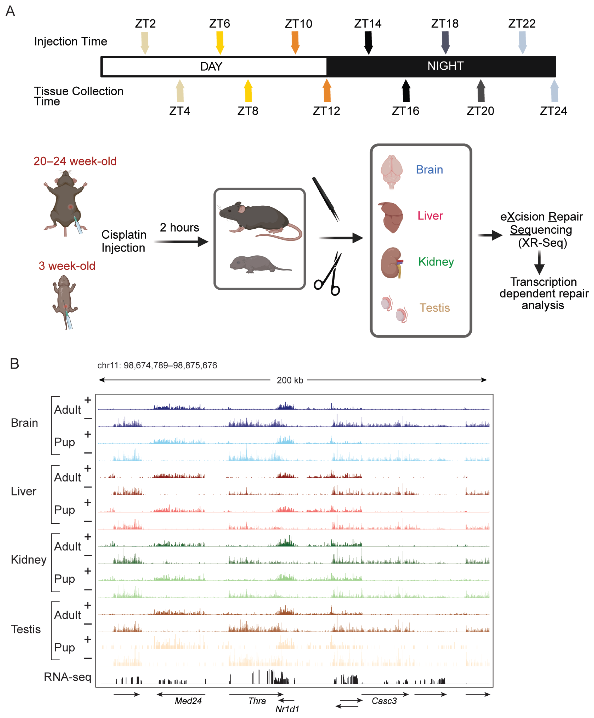 - Yang, Y.; Liu, Z.; Selby, C.P.; Sancar, A. Long-Term, Genome-Wide Kinetic Analysis of the Effect of the Circadian Clock and Transcription on the Repair of Cisplatin-DNA Adducts in the Mouse Liver. J. Biol. Chem. 2019, 294, 11960–11968. [Google Scholar] [CrossRef]