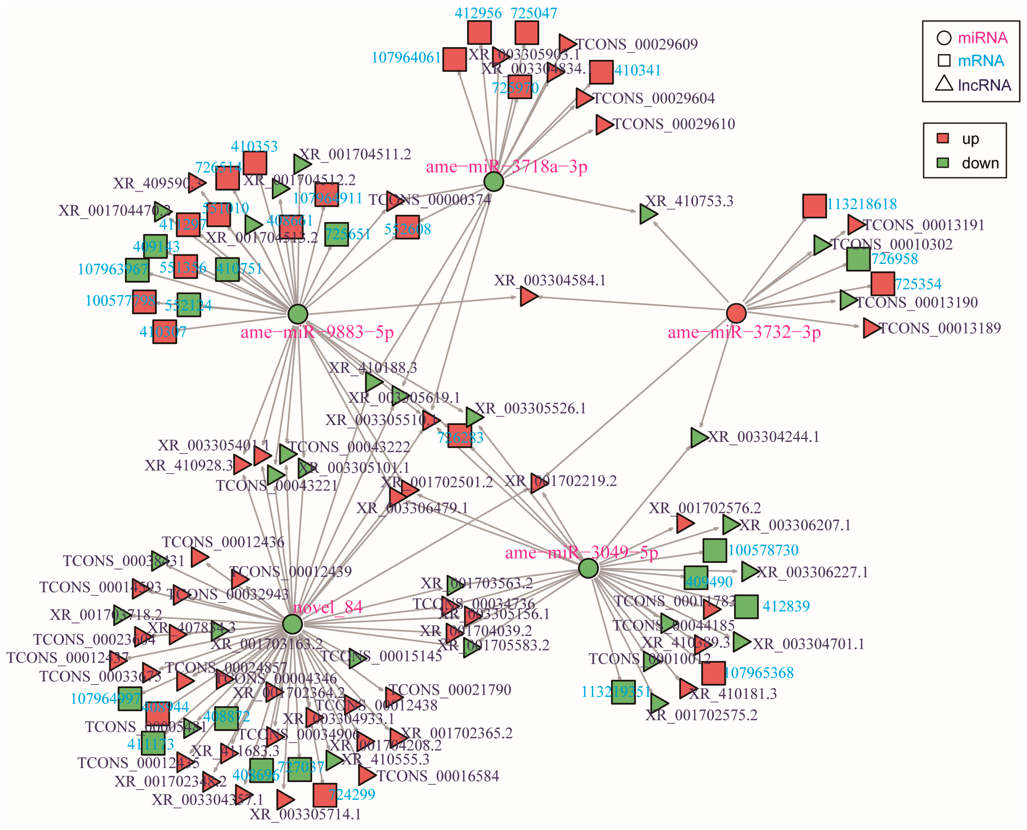 - Chen, X.; Ma, C.; Chen, C.; Lu, Q.; Shi, W.; Liu, Z.; Wang, H.; Guo, H. Integration of lncRNA-miRNA-mRNA reveals novel insights into oviposition regulation in honey bees. PeerJ 2017, 5, e3881. [Google Scholar] [CrossRef]