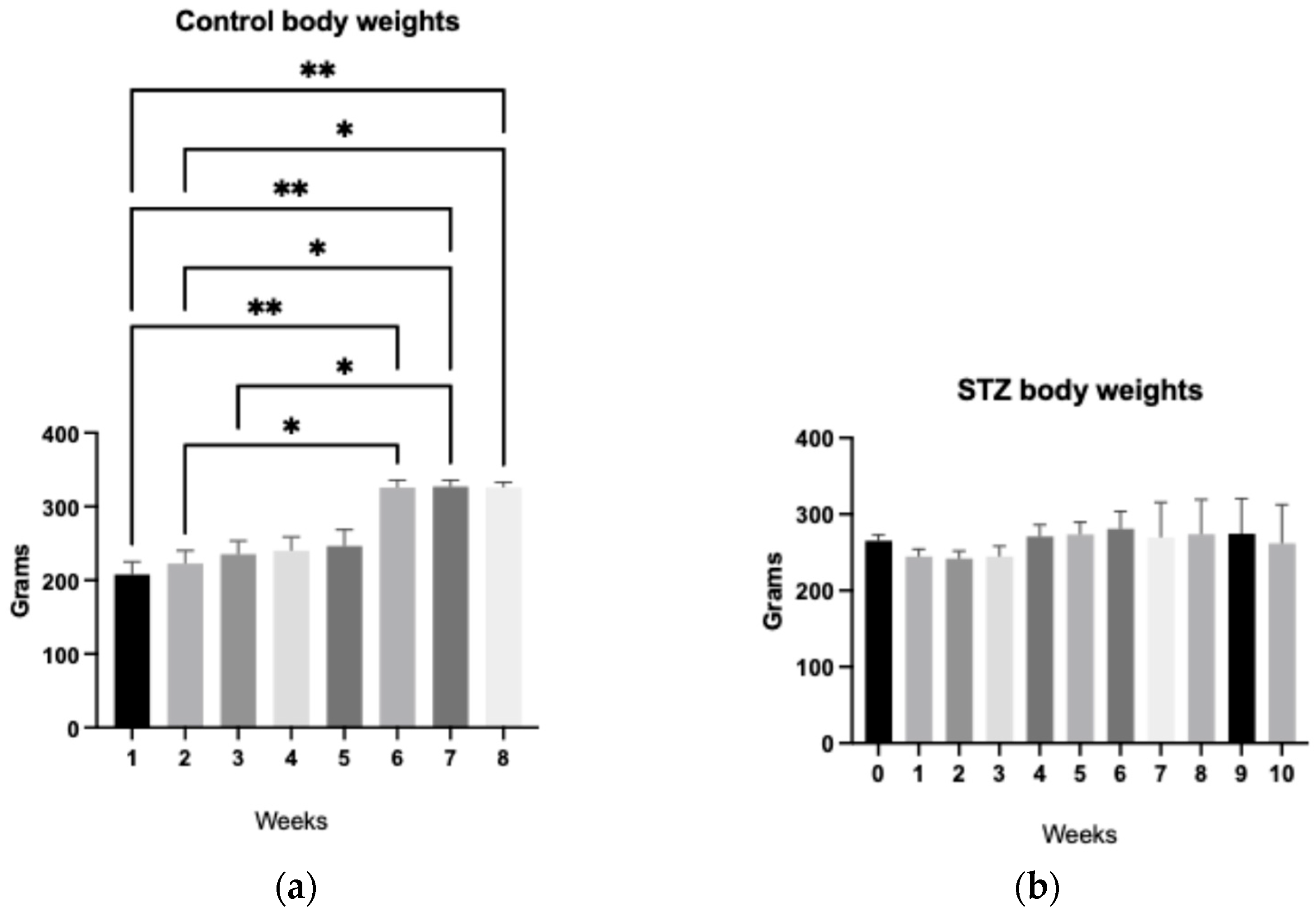 2.1.1. Streptozotocin-Induced Attenuation of Weight Gain in Wistar Rats in Early-Onset and Temporally Stable