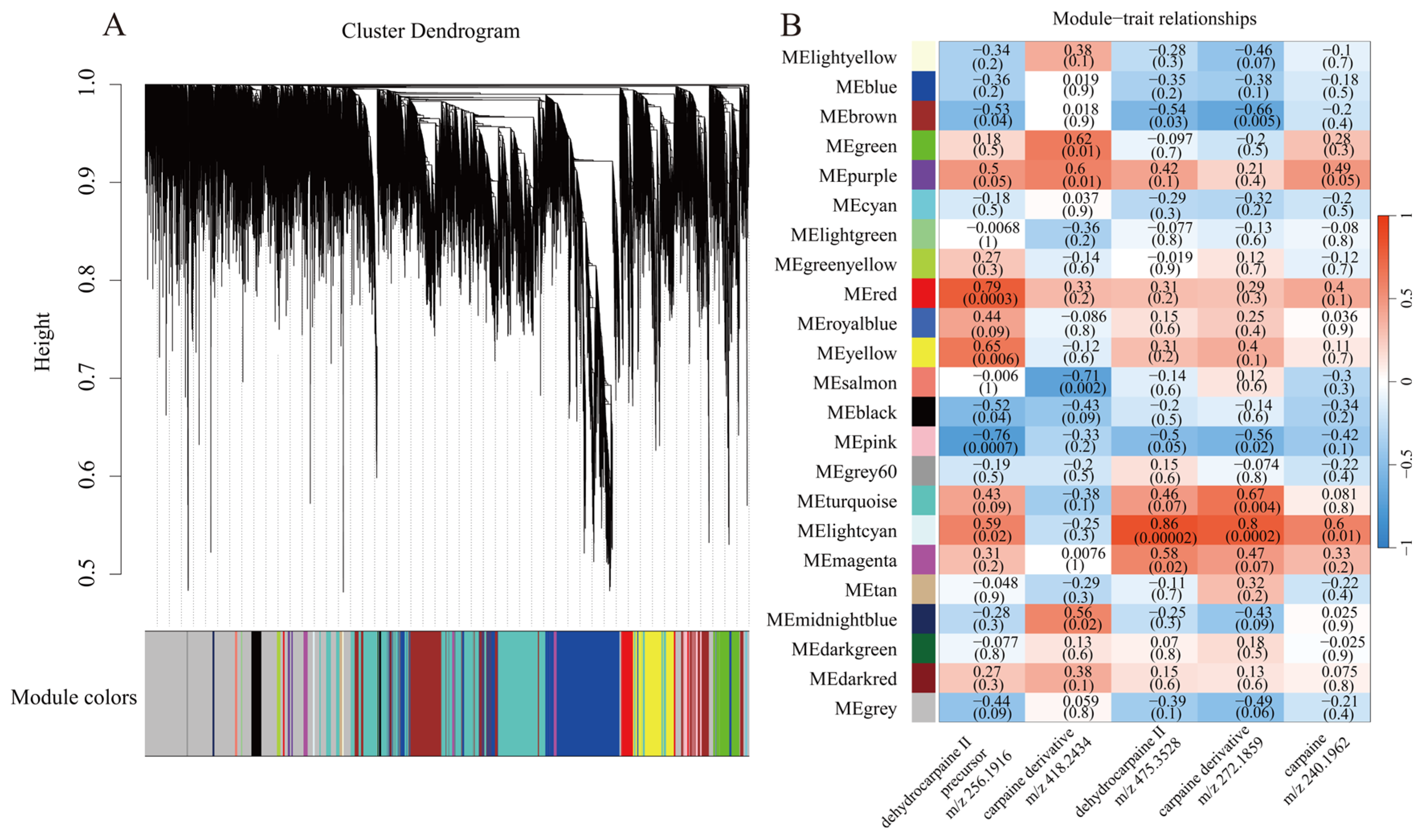 2.3.1. Association Analysis of Papaya Alkaloid Metabolites with Gene Co-Expression Modules