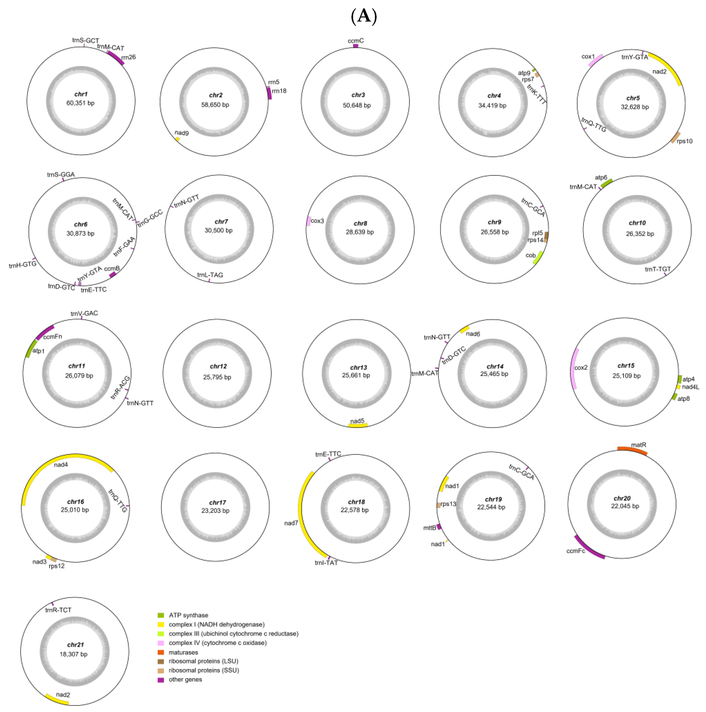 - Unseld, M.; Marienfeld, J.R.; Brandt, P.; Brennicke, A. The mitochondrial genome of Arabidopsis thaliana contains 57 genes in 366,924 nucleotides. Nat. Genet. 1997, 15, 57–61. [Google Scholar] [CrossRef]