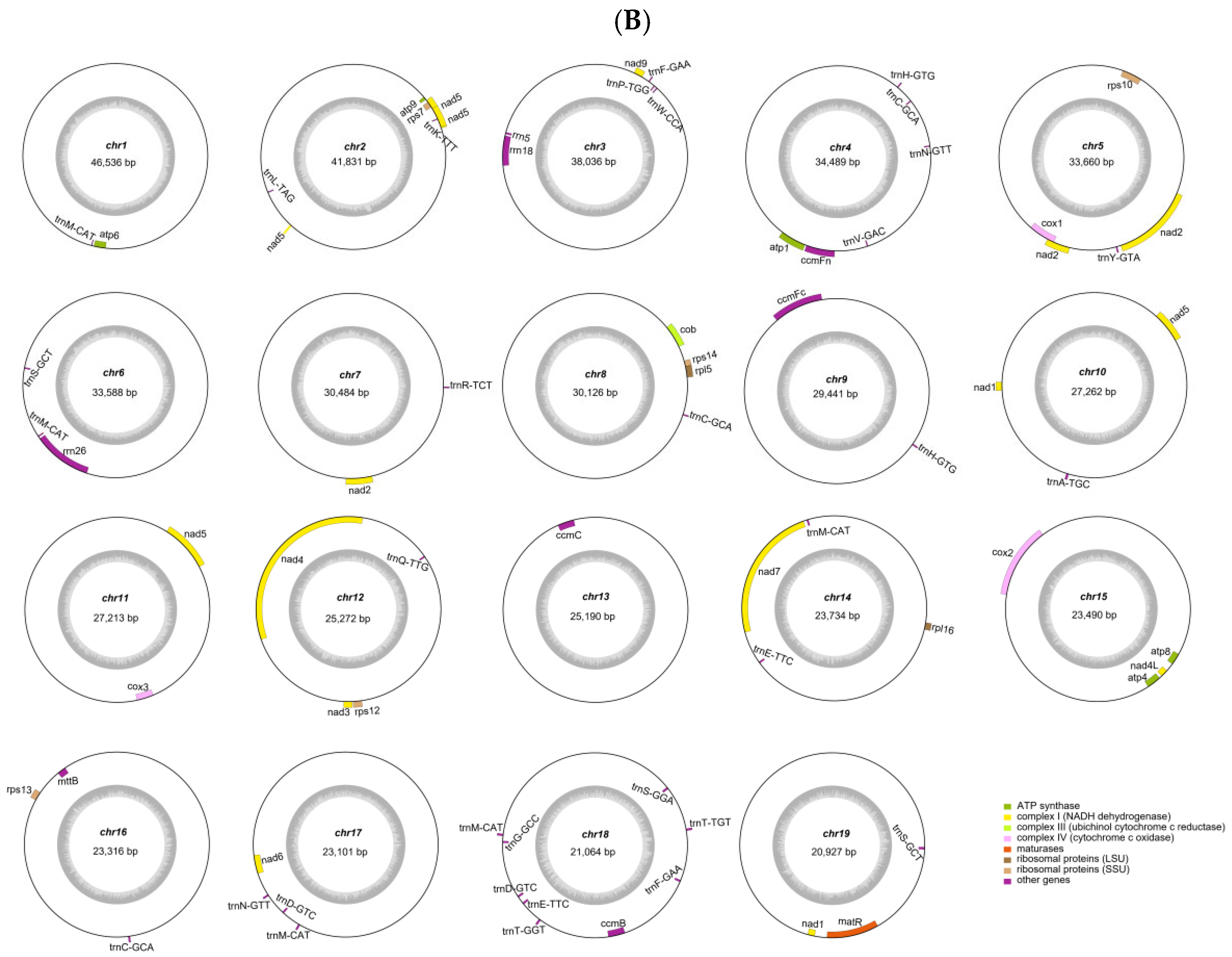 - Cole, L.W.; Guo, W.H.; Mower, J.P.; Palmer, J.D. High and variable rates of repeat-mediated mitochondrial genome rearrangement in a genus of plants. Mol. Biol. Evol. 2018, 35, 2773–2785. [Google Scholar] [CrossRef] [PubMed]