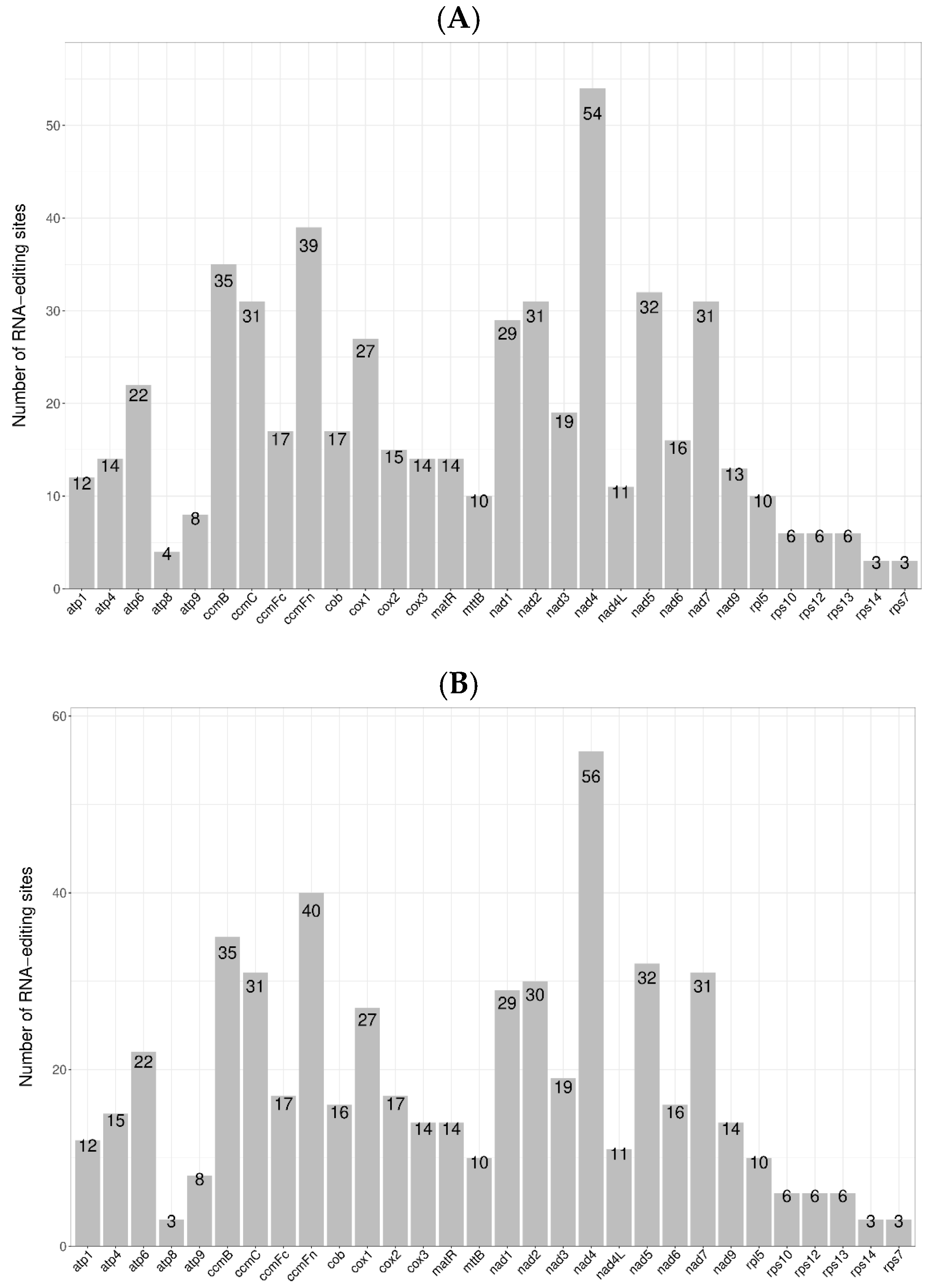 - Chen, T.C.; Su, Y.Y.; Wu, C.H.; Liu, Y.C.; Huang, C.H.; Chang, C.C. Analysis of mitochondrial genomics and transcriptomics reveal abundant RNA edits and differential editing status in moth orchid, Phalaenopsis aphrodite subsp. formosana. Sci. Hortic. 2020, 267, 109304. [Google Scholar] [CrossRef]