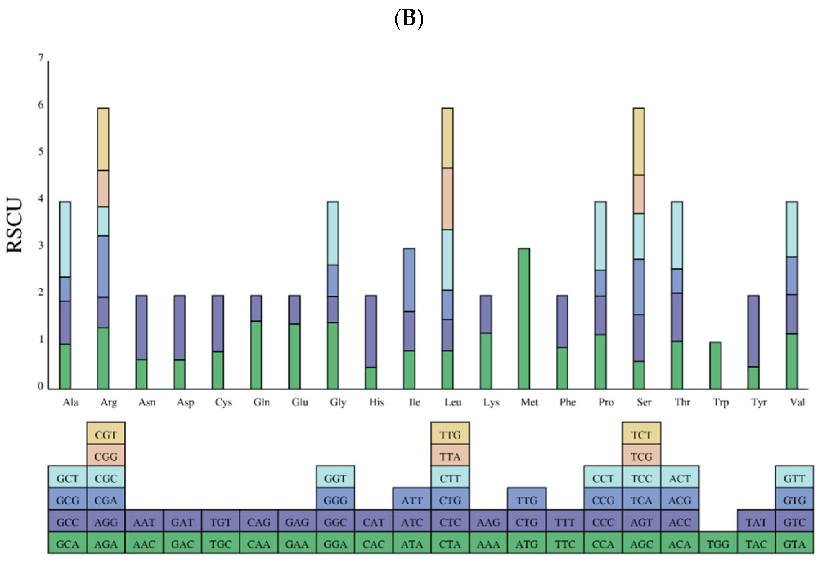 2.3. Relative Synonymous Codon Usage (RSCU) of the Mitochondrial Genomes of D. nobile Lindl. and D. denneanum Kerr.