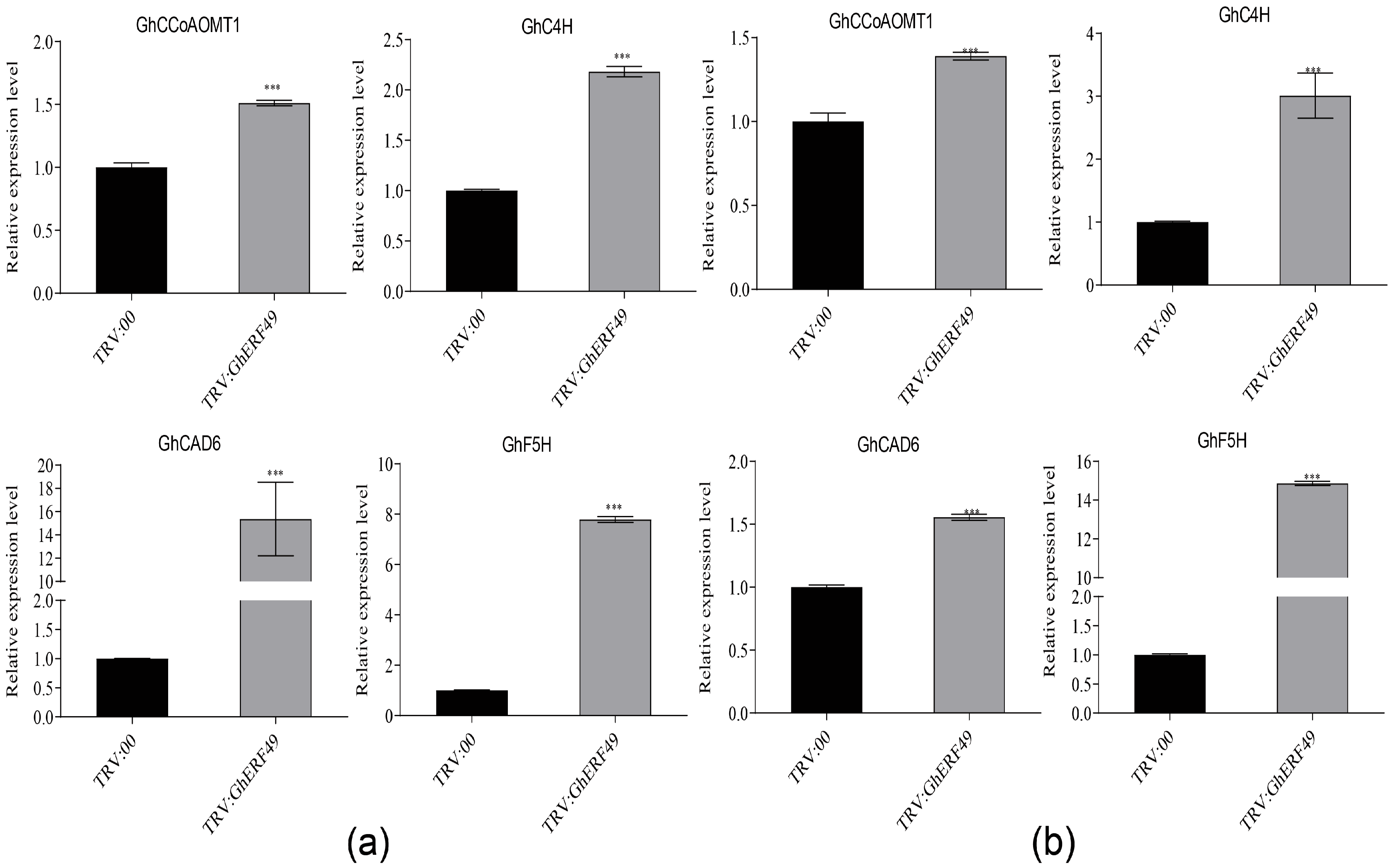 2.3. GhERF49 Negatively Regulates Lignin-Synthesis-Related Genes