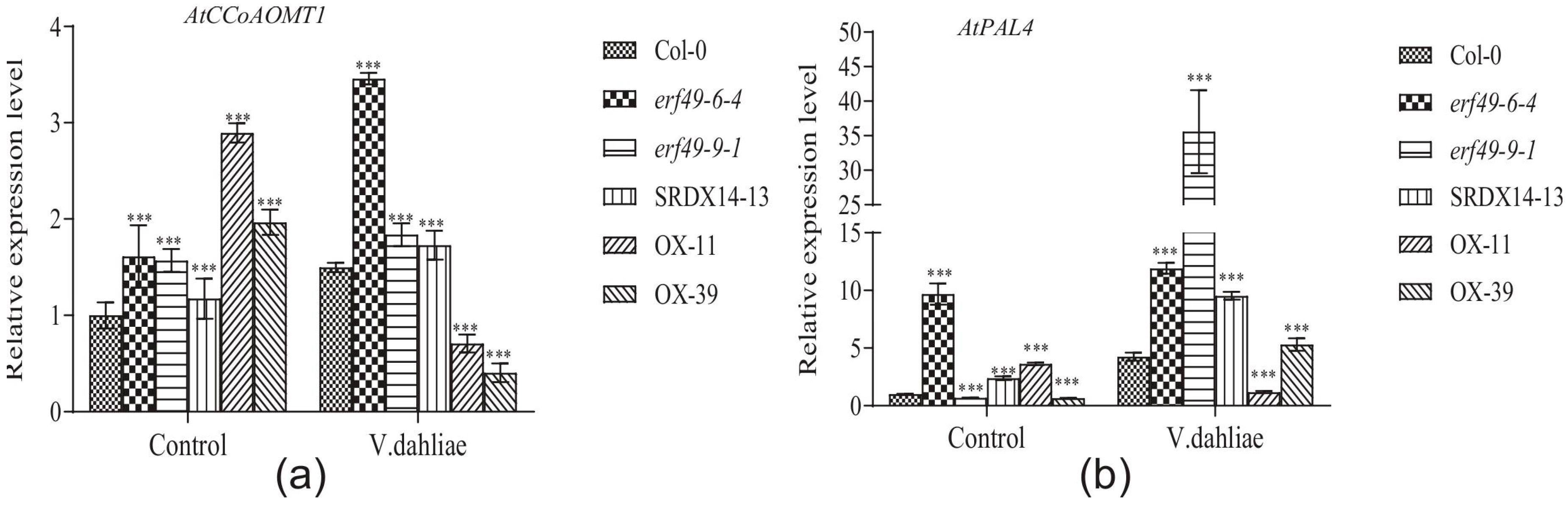 2.4. AtERF49 Negatively Regulates Expression of Lignin-Synthesis-Related Genes