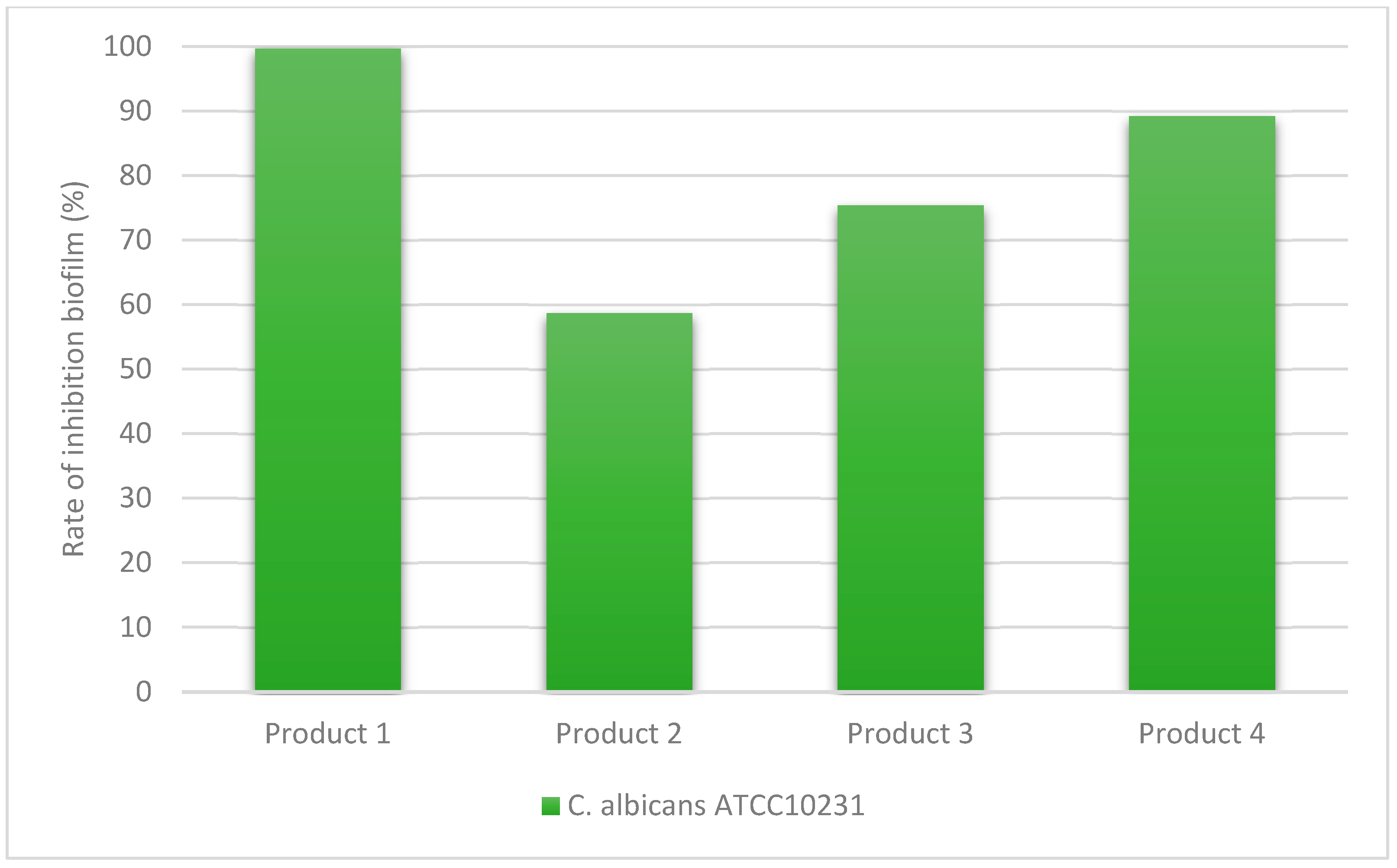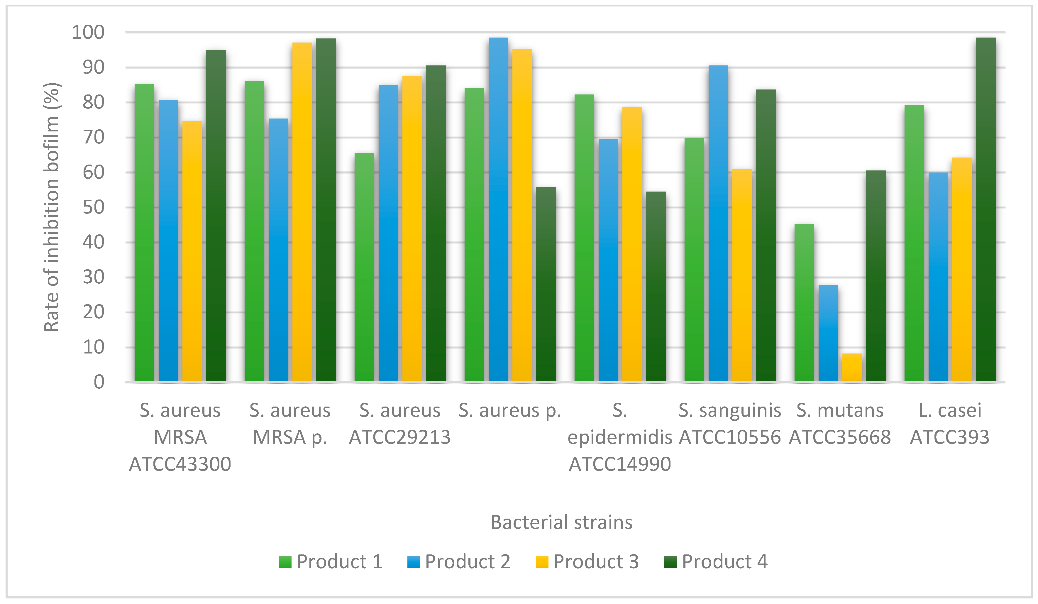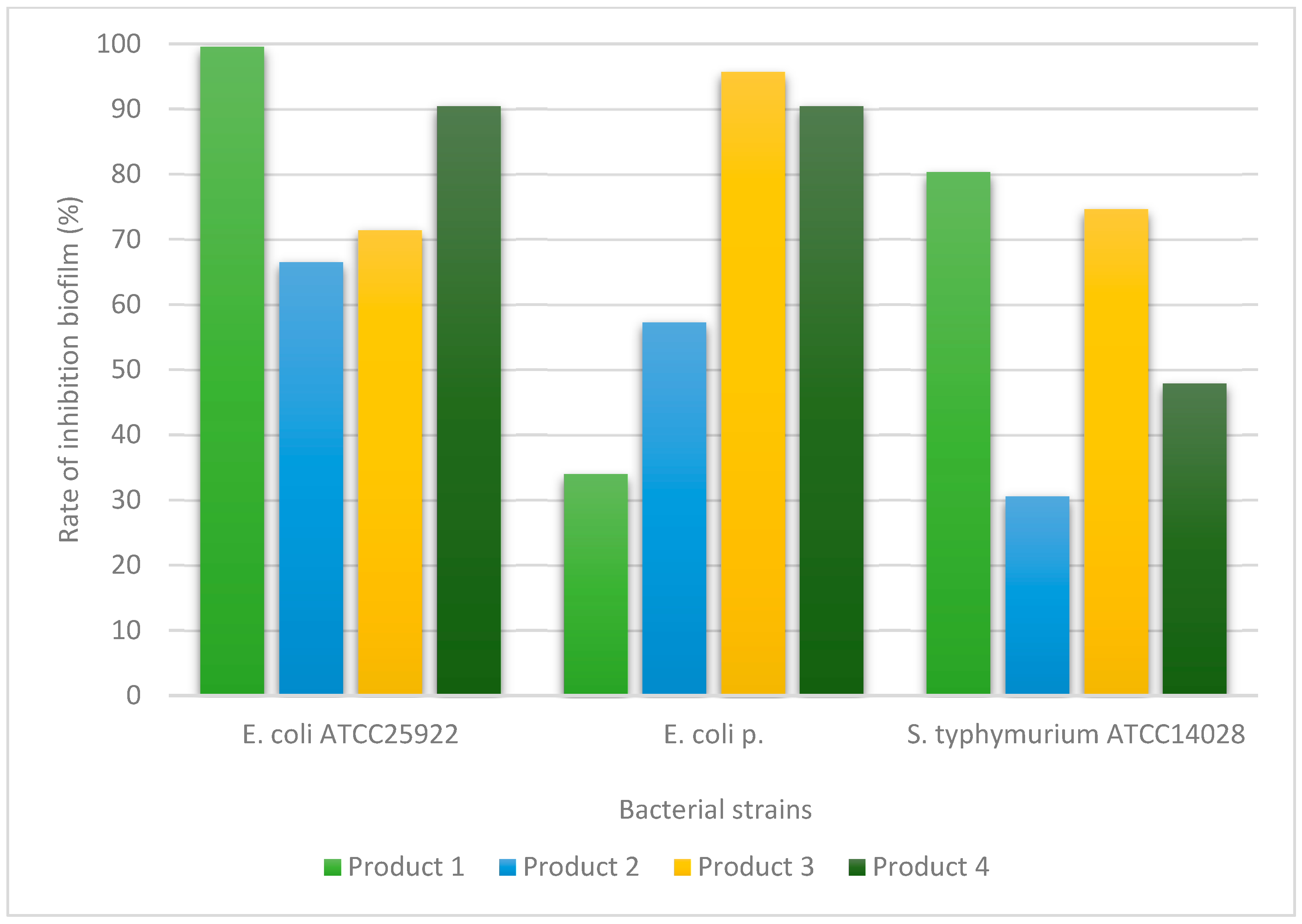 Figure 3 and demonstrate variations in antibiofilm activity depending on the tested product and the microbial strain.