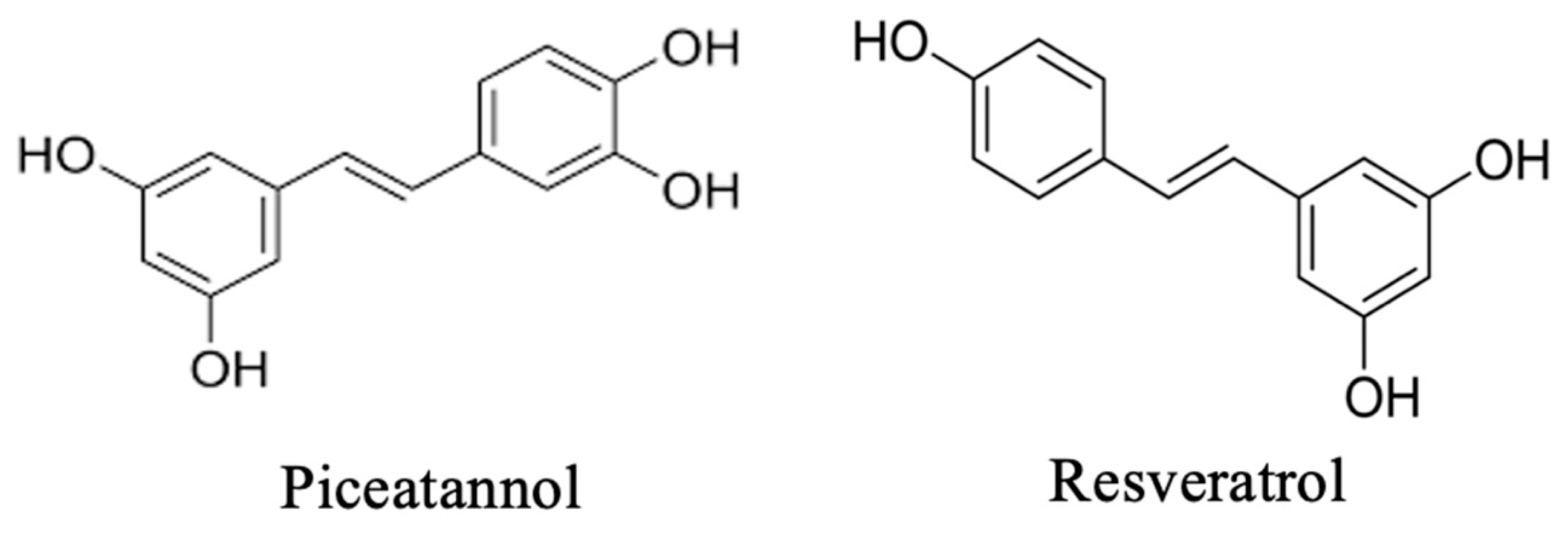 - Sun, R.; Li, W.; Liao, M.; Yu, Y.; Mou, Y.; Ji, J.; Chen, F.; Hu, X.; Ma, L. Piceatannol, a catechol analog of resveratrol, is more effective in improving glucose metabolism disorders. Food Biosci. 2025, 71, 107348. [Google Scholar] [CrossRef]