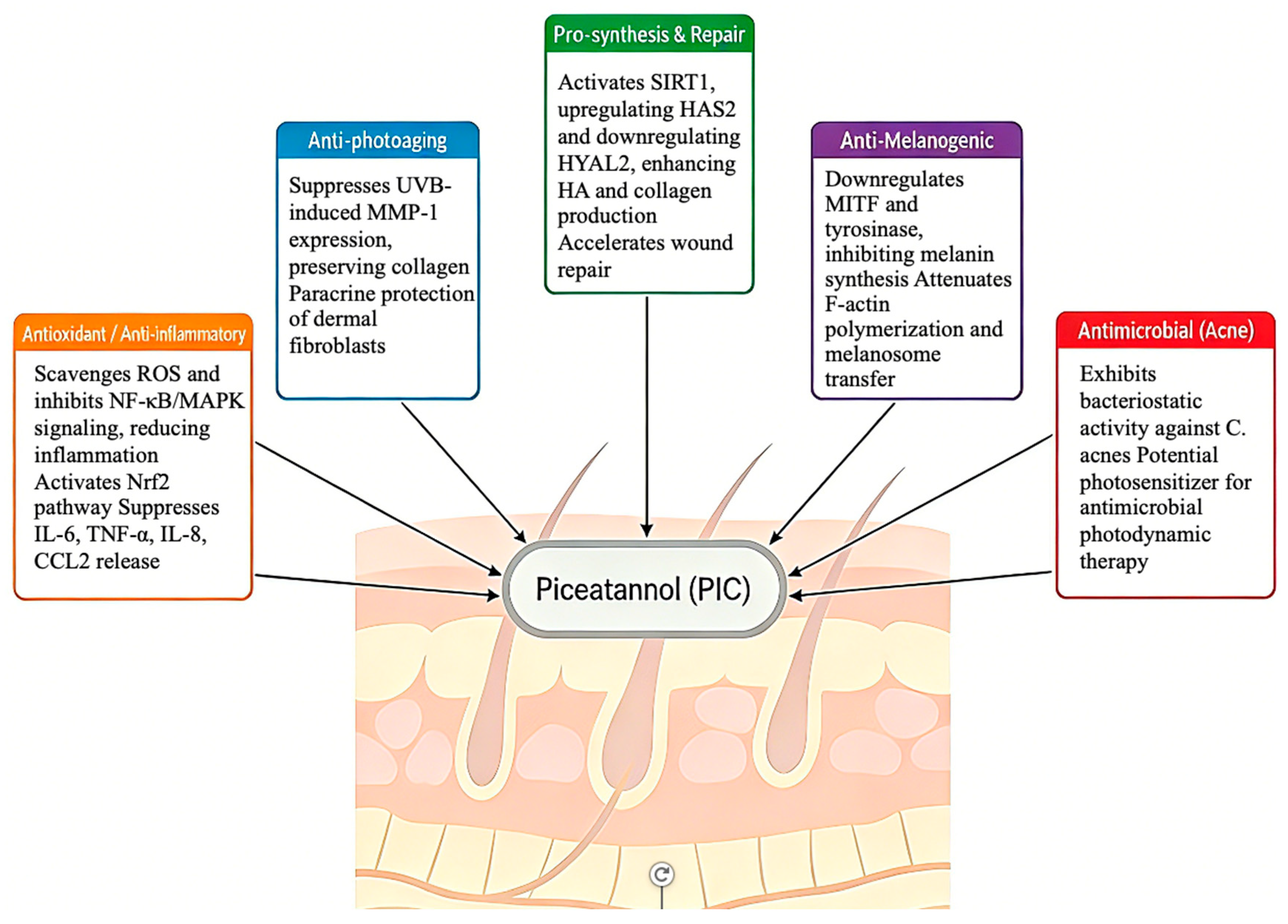 | Anti-photoaging | Human dermal fibroblasts (HDFs), UVB-irradiated HaCaT cells | PIC inhibits UVB-induced MMP-1/3 expression and collagen degradation; enhances type I procollagen synthesis via SIRT1 activation. Superior to resveratrol in some assays. | Anti-wrinkle, firming, collagen-boosting, photoprotection booster | [39,40,41] |