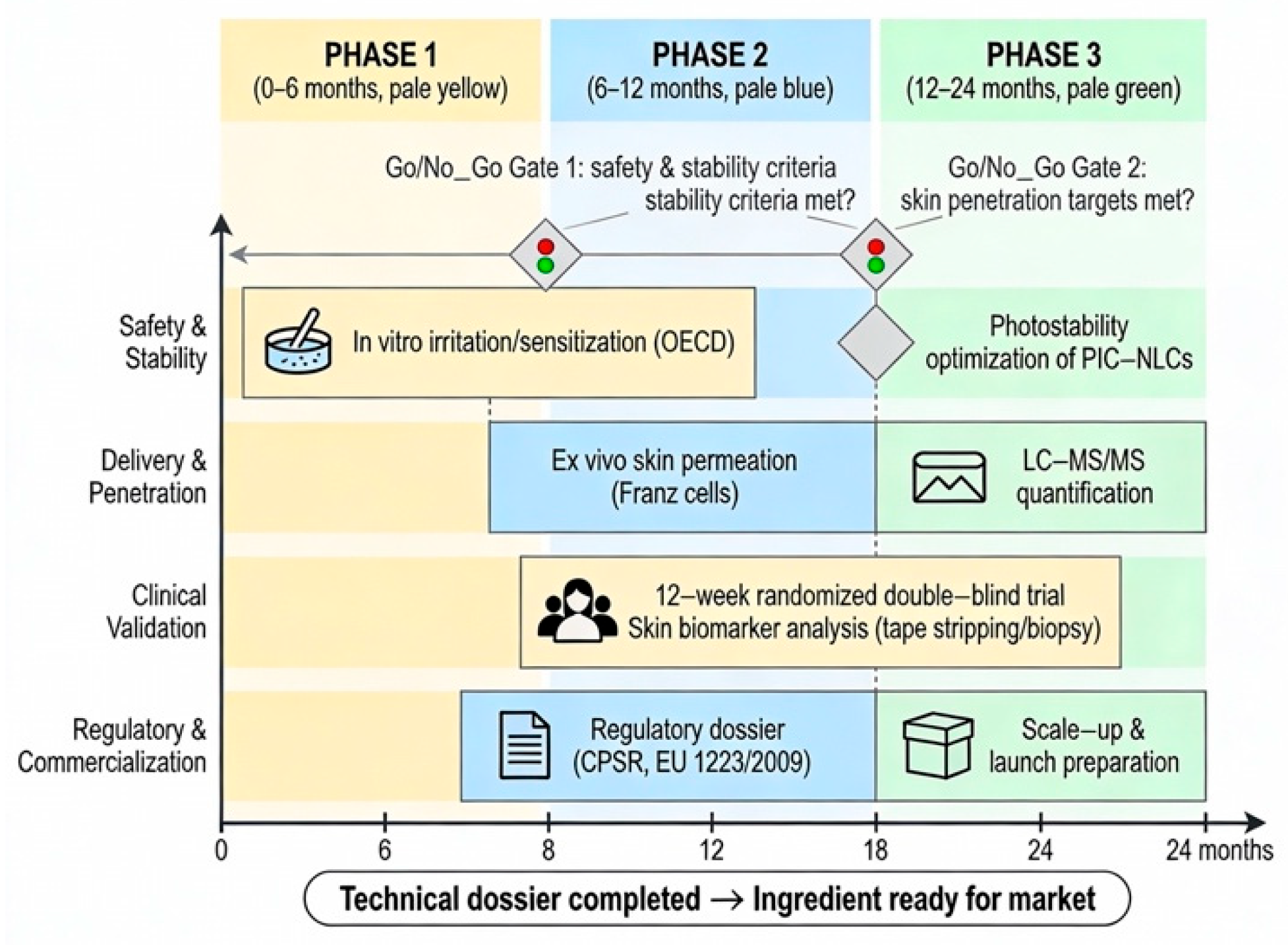 - Photostabilization. Formulate PIC within PFS oil-based nanostructured lipid carriers (NLCs) and test the hypothesis that such encapsulation significantly reduces UVA/UVB-induced photodegradation compared to an unformulated control using established photostability protocols adapted from ICH Q1B and prior NLC photostability work. While systemic delivery differs from topical application, the principle that nanoencapsulation can profoundly enhance the stability and bioactivity of PIC is further supported by recent advances in nanomedicine, including a red blood cell membrane-coated biomimetic nanoparticle that achieved sustained release of PIC under hypoxic conditions [70]. This reinforces the rationale for exploring lipid-based nanocarriers in dermal delivery. Moreover, the compatibility of antioxidant-loaded NLCs with nanosized UV filters in stable, non-irritating topical gels has been recently demonstrated, supporting the feasibility of integrating PIC-NLCs into multifunctional photoprotective formulations [71].