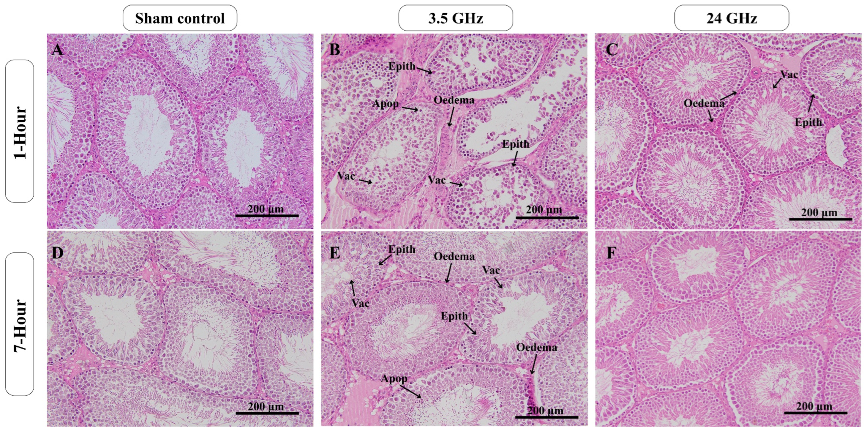 In summary, under low-level exposure conditions defined by numerical dosimetry at a 20 cm source-to-animal distance, repeated 3.5 GHz and 24 GHz RF-EMF exposure preserved overall seminiferous tubule structure but altered testicular HSP27, HSP70, and HSP90 expression in a frequency- and duration-dependent manner. The present data support frequency- and duration-associated modulation of testicular heat shock protein expression under the tested exposure conditions, but the extent to which these changes were independent of thermal contributions remains to be clarified in future studies incorporating direct temperature assessment.