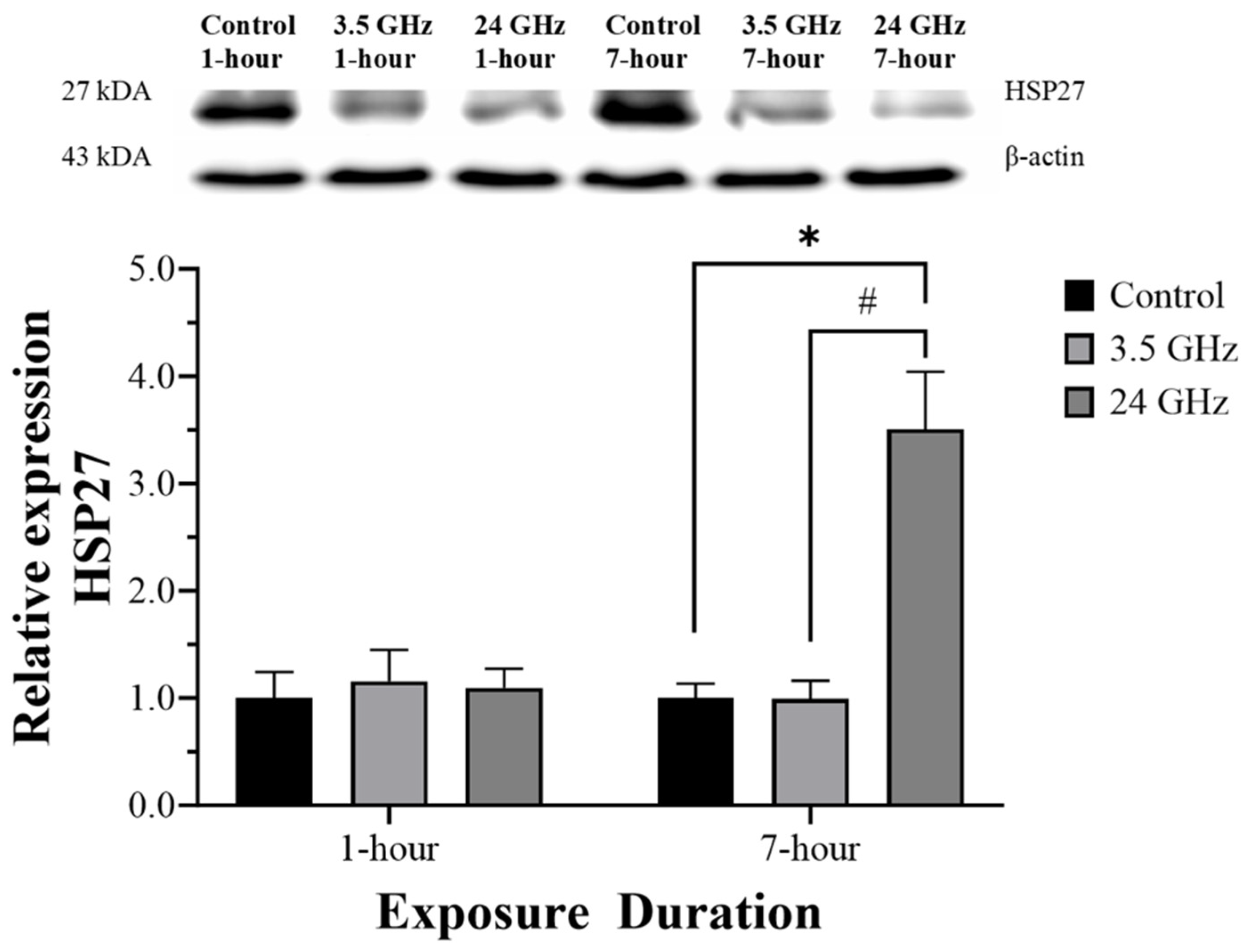 Despite the limited structural alteration, testicular heat shock proteins were modulated in a frequency- and duration-dependent manner, supporting the view that molecular stress markers may shift even when overt tissue injury is not apparent. After 7 h/day of exposure, HSP27 was selectively increased in the 24 GHz group. This is biologically plausible because HSP27 is a stress-responsive small heat shock protein involved in actin cytoskeletal regulation, redox homeostasis, and cytoprotection [