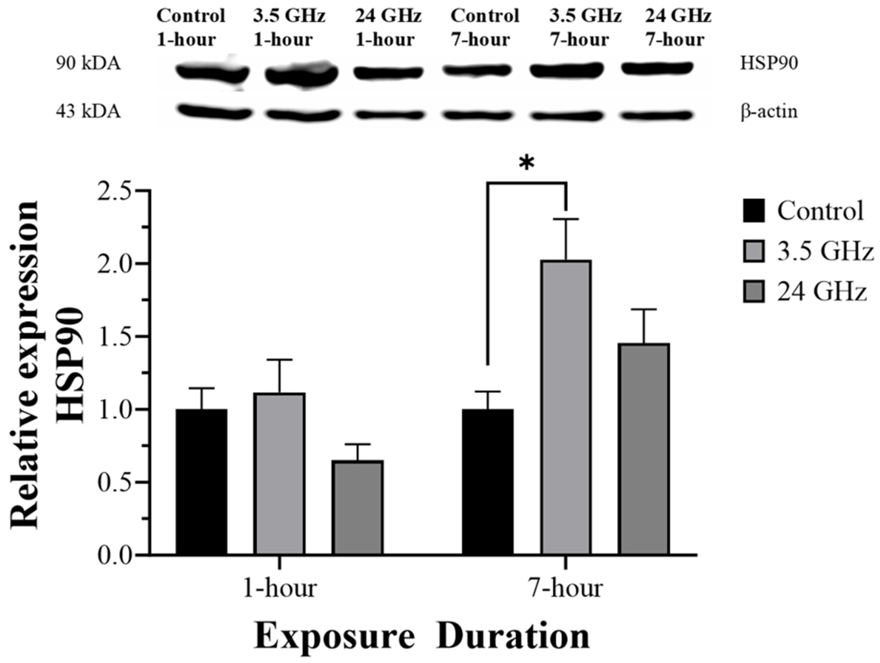 In contrast, 3.5 GHz exposure was associated with a selective increase in HSP90 after 7 h/day. Relative to 24 GHz, mid-band frequencies are expected to produce deeper and more spatially distributed absorption, which is consistent with the higher estimated SAR values observed at 3.5 GHz in the present dosimetry. HSP90 is a major molecular chaperone involved in the stabilization and functional regulation of client proteins, including proteins relevant to spermatogenesis and male fertility [