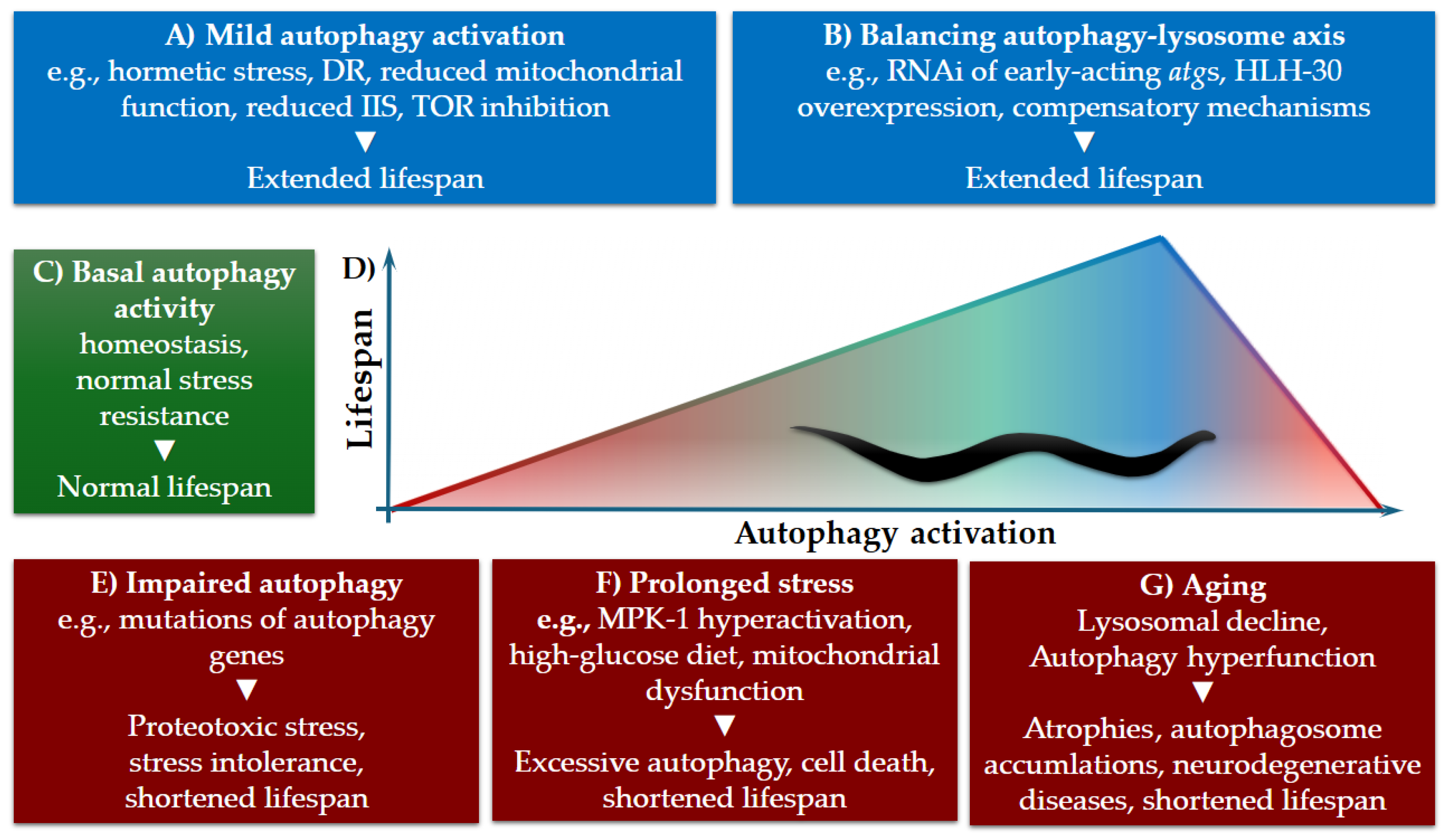 | TOR pathway inhibition | Genetic triggers | bec-1, unc-51, atg-18 | Mutants | Multiple tissues | No | [16] |