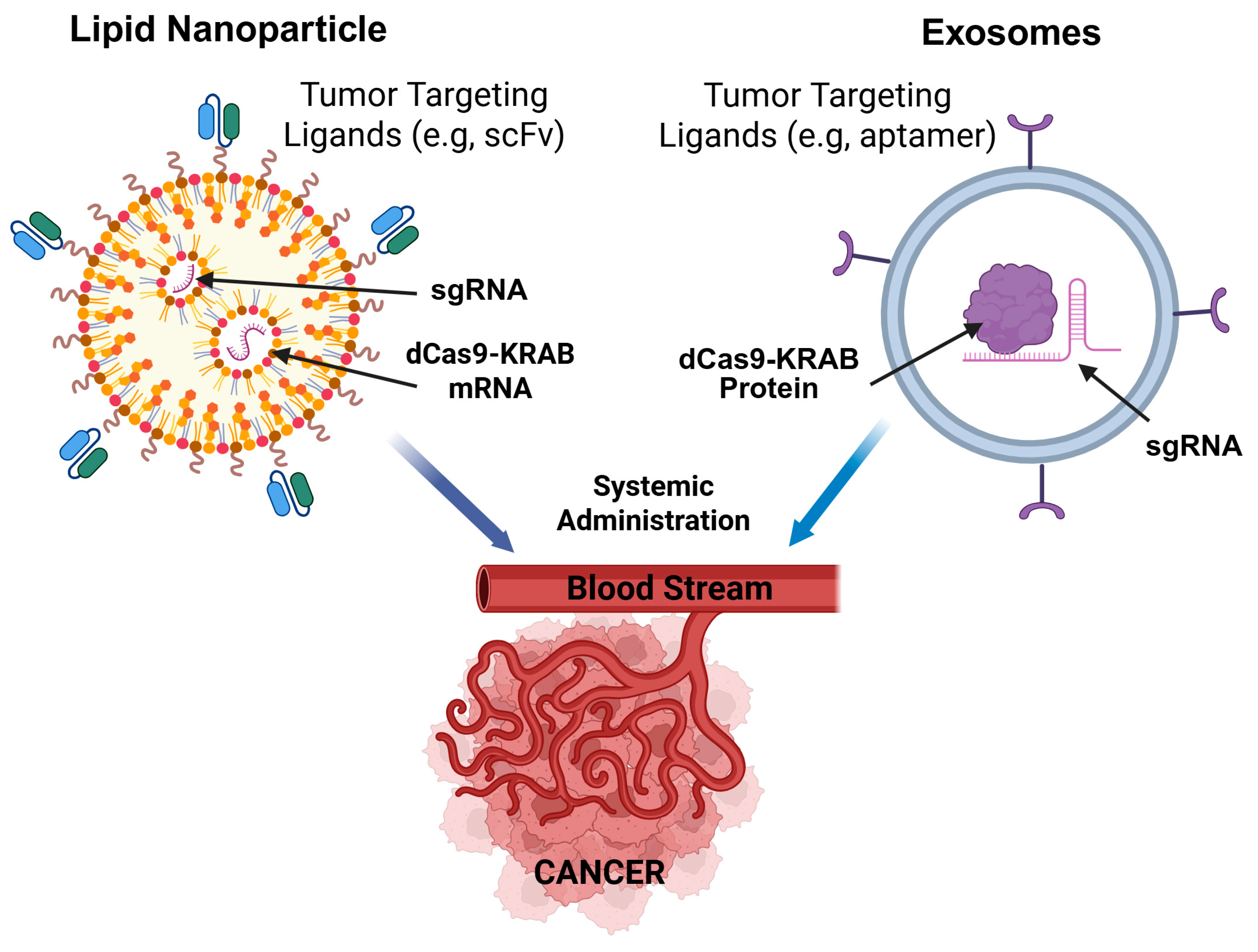 | KRAS | dCas9-HDAC1 | Colon and pancreatic cancers | Plasmid or recombinant protein | Inhibition of tumor growth in vitro | [56] |