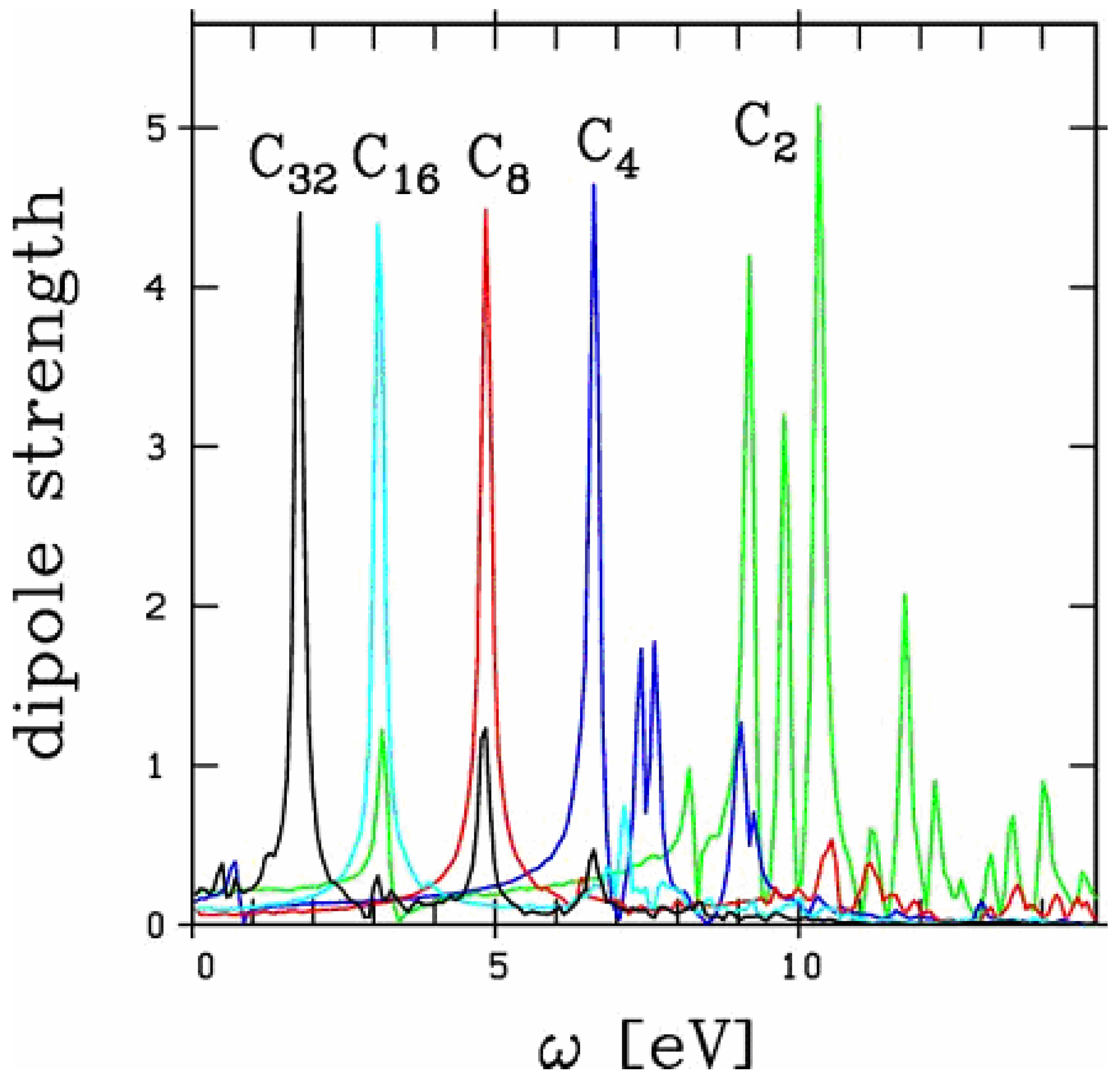 have been unambiguously observed up to 15 C atoms [19,20]. The extension to 32 atoms, as presented in the figure, is thus somewhat academic. Still, the existence of such a structure cannot be fully excluded. We focus here on the longitudinal response, namely the electronic response along the chain. The latter exhibits a strong size dependence as discussed in [21]. In these carbon chains, this response is basically composed of well marked low energy, strongly size dependent, peaks and of a set of very diffuse structures in the 20 eV range. Most of the collective part of the response is concentrated in the low energy structures and we restrict the analysis on this energy range in the following, as in [21]. As can be seen from Figure 1, except for the 2 smallest species (chains with 2 and 4 atoms) the optical response is dominated by one single peak. In small chains, although the response is slightly more fragmented, a well defined peak remains clearly visible. The energy of this peak strongly decreases with size reflecting a clear geometric effect: the longer the chain and thus the participating electron cloud, the longer the oscillation period and hence the smaller the frequency. In order to visualize this effect in a clearest manner we plot in Figure 2 the energy of this main peak as a function of chain size. For completeness we have also reported the experimental results of [19,20] and the theoretical results of [21] (TDLDA calculations) and [17,18] (quantum chemistry CI calculations). The agreement between all calculations and experiments is impressive, in all cases for which the comparison is possible.