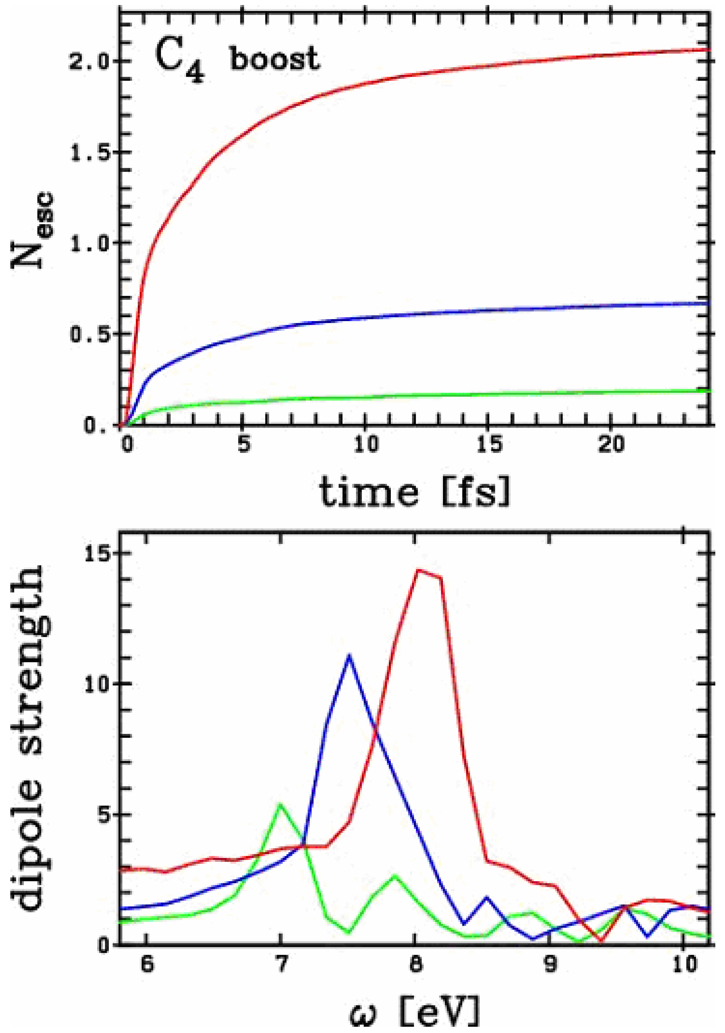Optical response (lower panel) and ionisation (upper panel) of a C4 chain to excitations of various strengths of excitation. The initial boost placed the following amounts of energy into the cluster: green = 0.3 Ry, blue = 1.3 Ry, and red = 5.1 Ry.