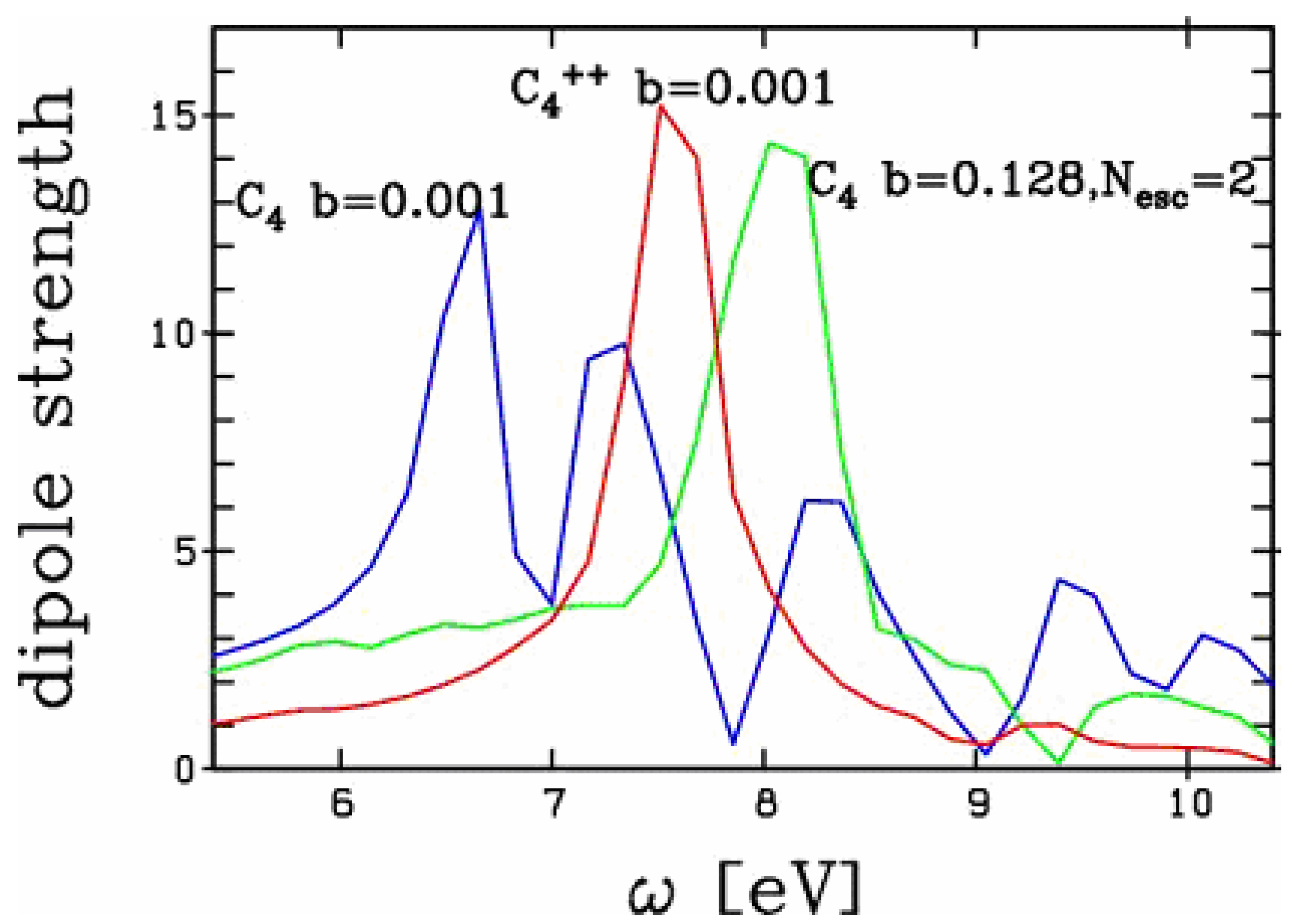 In order to explore whether the blue shift observed in Figure 3 is a pure electrostatic effect or not, we have compared the optical response as obtained by a non-linear excitation of C4 leading to highly excited C4++, to the linear response of ground state C4++. The comparison is presented in Figure 4. For completeness we have also plotted the optical response of ground state C4 in the linear domain. We observe a marked difference between the optical responses of the two doubly ionized clusters: the two peaks differ by 0.5 eV. The charge effect thus only explains about half of the total blue shift of the