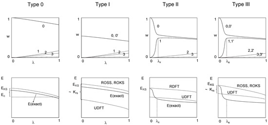 Schematic representation of wave function and energy of type 0, type I, type II, and type III electronic systems as described by RDFT or UDFT with approximate exchange-correlation functionals (dotted lines) or exact Kohn-Sham DFT (solid line). Numbers 0, 1, 2, etc. denote configuration state functions Ψ0, Ψ1, Ψ2, etc. or determinants Φ0, Φ1, etc. The weights w of the configuration state functions in the true wave function are schematically shown (first row of diagrams) in dependence of the parameter λ that stepwise increases the electron correlation energy Ec from zero (λ = 0) to its true value (λ = 1). The corresponding changes in the Kohn-Sham energy EKS and in the exact energy E(exact) is schematically given in the second row of diagrams.