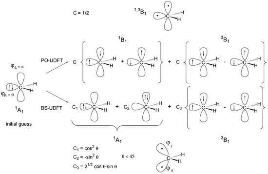 The resulting state is a mixture of the |⟩ and |⟩ singlet states and the|⟩T (MS = 0) triplet state, i.e. the spin symmetry is broken as in the case of PO-UHF (PO-UDFT). With respect to spatial symmetry, the BS-UHF (BS-UDFT) reference state does not belong to any irreducible representation but is part of a reducible representation that consists of a 1A1 and a 3B1 contribution for 1 and a 1A′ and a 3A″ contribution for 2. However, it is important to note that the BS-UHF (BS-UDFT) reference function is not completely asymmetric but represents an irreducible representation of a mixed spin-space symmetry group where all reflections at the mirror plane are combined with a simultaneous flip of all spins in the system. The PO-UHF (PO-UDFT) wave function is not symmetric with respect to this combined symmetry group.