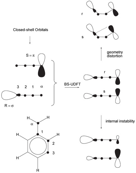 - (a) Fukutome, H. Unrestricted Hartree-Fock theory and its applications to molecules and chemical reactions. Int. J. Quantum Chem. 1981, 20, 955–1065. [Google Scholar] (b) Yamaguchi, K. Symmetry and broken symmetry in molecular orbital (MO) descriptions of unstable molecules. Generalized MO theoretical studies on 1,3-dipolar species. J. Mol. Struct. (THEOCHEM) 1983, 12, 101–120. [Google Scholar]