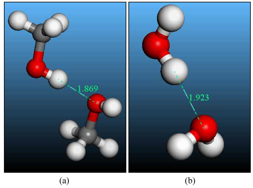 (a) Methanol dimer, (b) Water dimer with hydrogen bonds and distances shown.