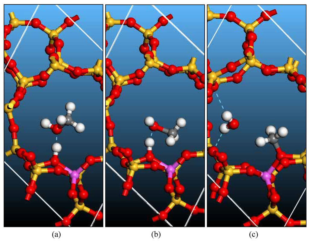 Surface methoxyl formation with a single methanol molecule via a strained SN2 type reaction. (a) Hydrogen-Methanol complex at the Brønsted acid site, (b) Transition state structure, (c) Surface methoxyl. Dotted lines represent hydrogen bonds.