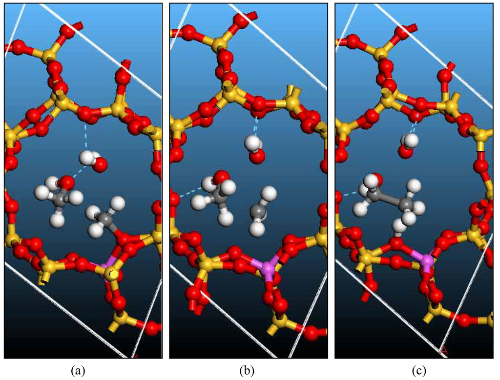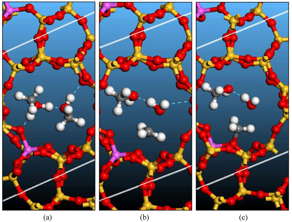 Formation of ethanol. Note that the water molecule is hydrogen bonded to the cage through the entire reaction and plays no visible role. This is a conventional SN2 type reaction involving the methoxyl species and the methanol molecule. (a) Surface methoxyl and methanol-water complex, (b) Transition state structure, (c) Ethanol molecule and proton transfer to Brønsted acid site. Dotted lines represent hydrogen bonds.
