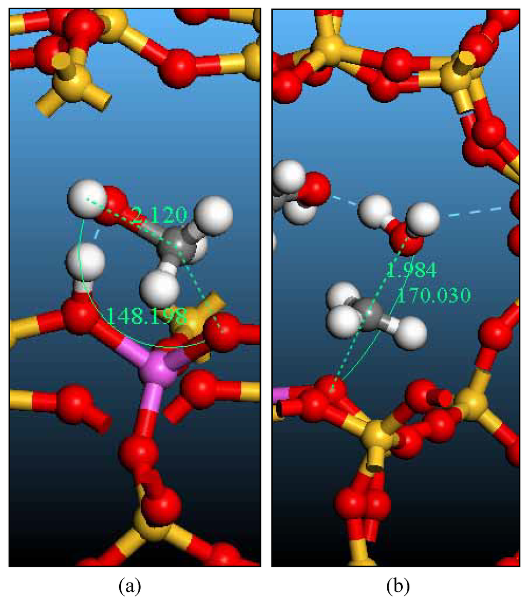 Introducing a second methanol, interestingly, lowers the above activation barrier to 44 kcal/mol. This can be understood easily as this transition state now corresponds to an unstrained SN2 pathway (see Figure 3). At the transition state the surface oxygen, methyl carbon and the oxygen of the water molecule that leaves are roughly collinear (Figure 3b). The water molecule is formed as a result of proton transfer to the methanol hydroxyl group from the methoxonium ion. Our computed barrier of 44 kcal/mol is comparable with 32-46 kcal/mol as predicted by the MP2/5-31G*//HF/3-21G studies of Sinclair and Catlow [] on clusters of various sizes. This reaction is facilitated by hydrogen bonded methanol and methoxonium ion (Figure 3a). Methoxonium ion is formed spontaneously when a methanol molecule captures the proton from the Brønsted acid site. No barrier was found for that reaction in agreement with the work of Sandre et al []. Clearly, the presence of the second methanol molecule in the zeolite cage facilitates the formation of a methoxonium ion formation. No spontaneous de-protonation of the zeolite was observed with one methanol molecule.
