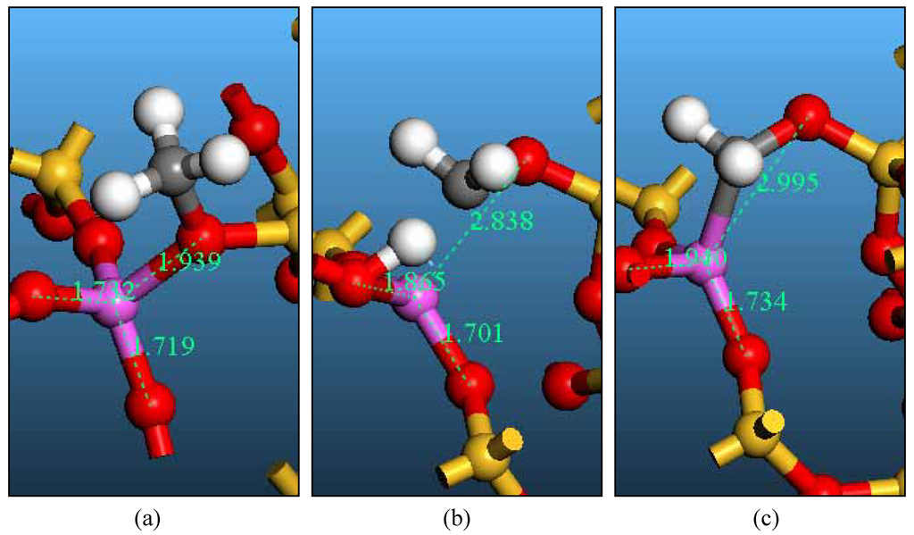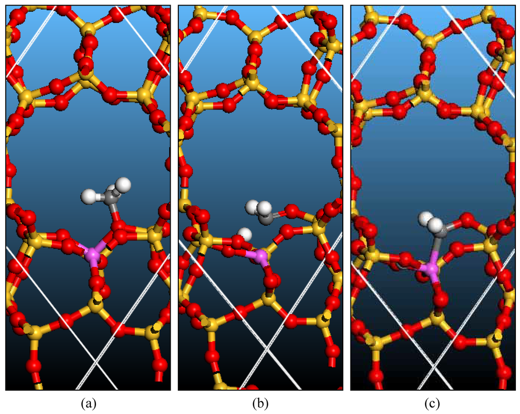 Local distortion around the Brønsted acid site. (a) Surface methoxyl, (b) Transition state structure, (c) ylide structure incorporated into the zeolite framework.
