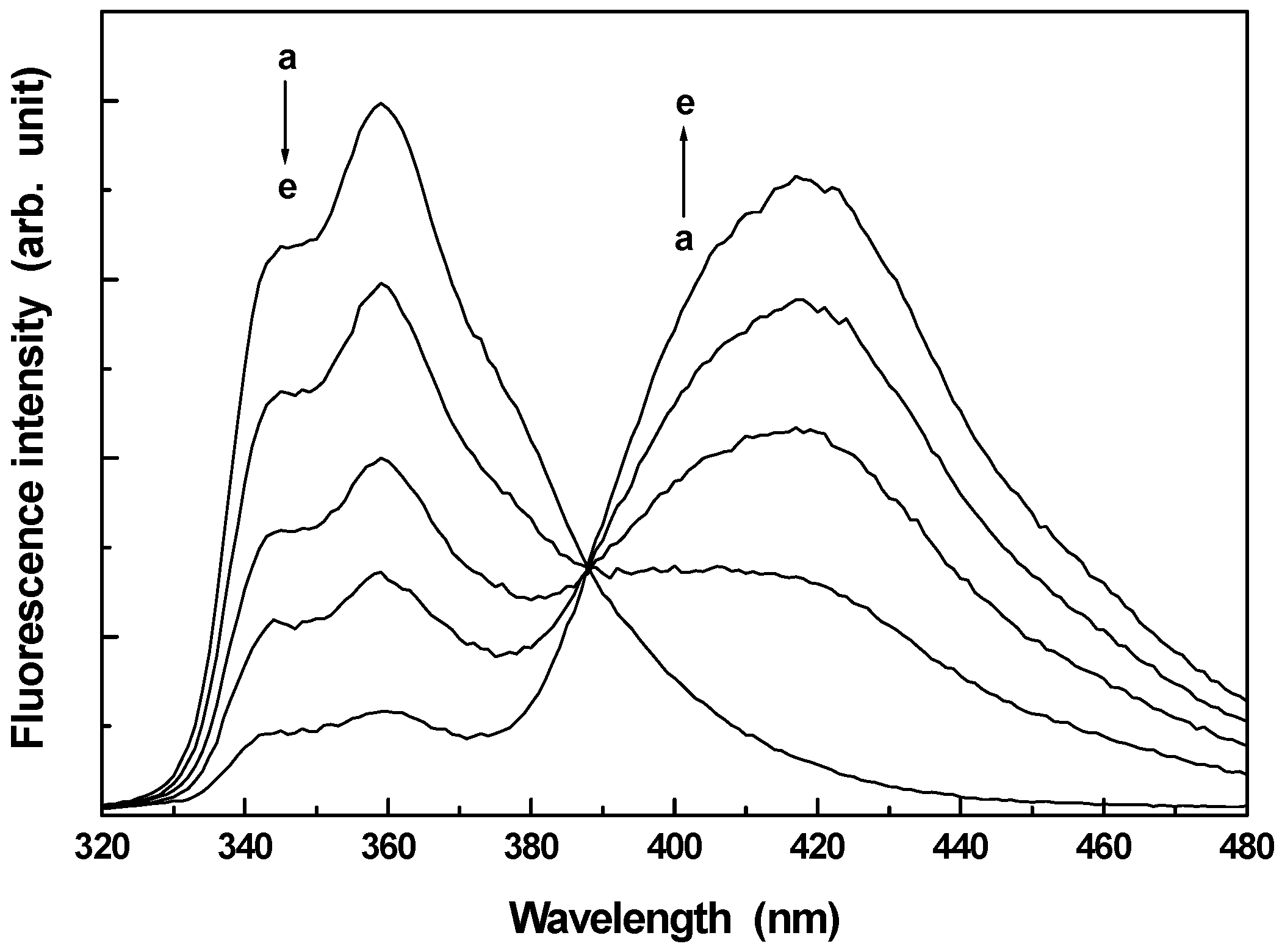 Fluorescence spectra of CAZL in presence of different concentrations of NaOH. a → e corresponds to 0.0, 0.005, 0.01, 0.02 and 0.06M NaOH respectively. The excitation wavelength is 295 nm.