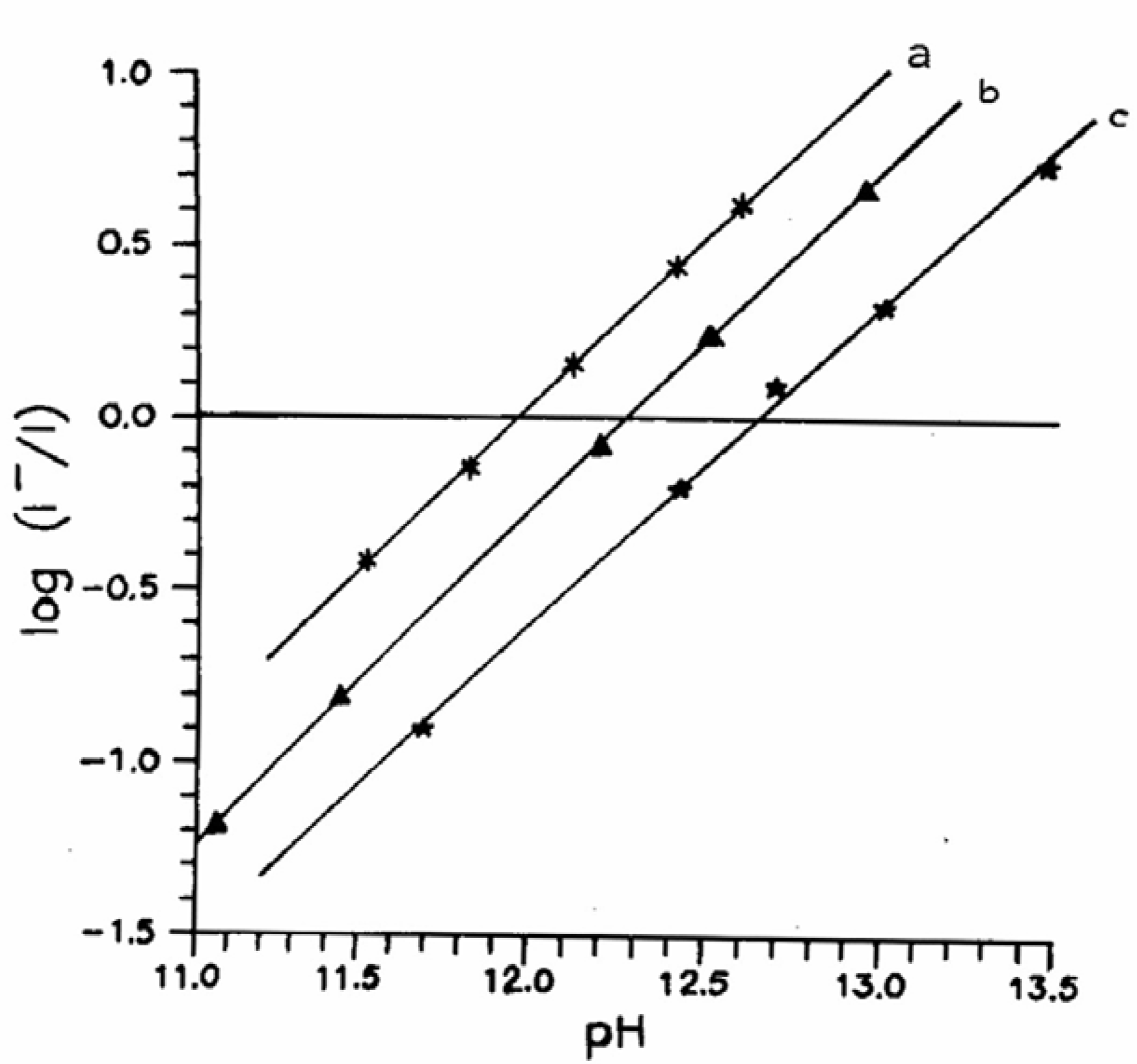 Plot of log(I─/I) vs. pH of the solution: (a) CAZL – NaOH; (b) INDZ –NaOH; (c) 2HB – NaOH.