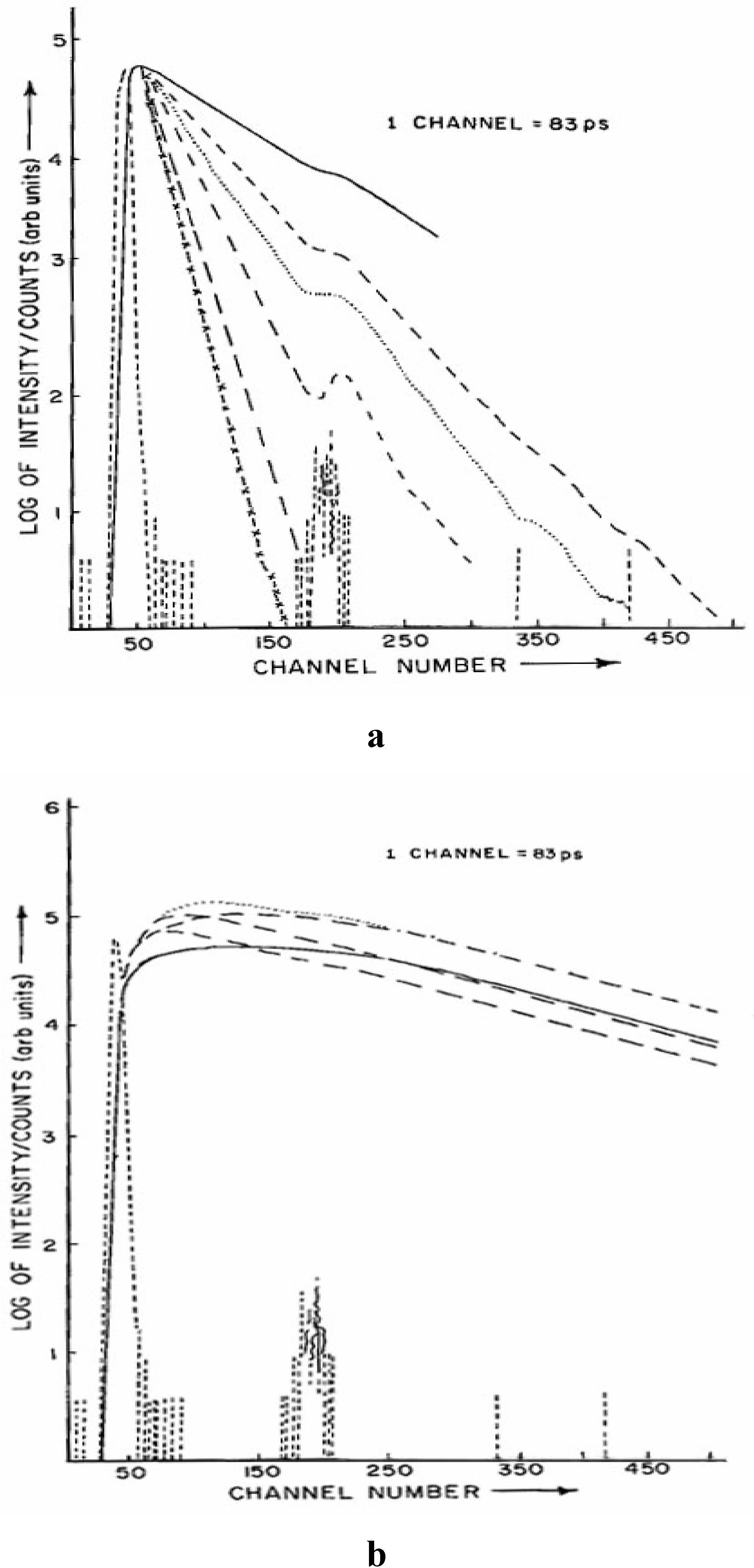 Fluorescence decay curves of the a) neutral CAZL monitored at 360 nm (λexc. = 295 nm) and b) anionic species of CAZL monitored at 415 nm (λexc. = 295 nm). Different concentrations of OH─ from top to bottom in (a) are: 0.0N, 0.005N, 0.01N, 0.02N, 0.04N and 0.06N respectively (…….. is the pump profile). Different signs of the various decay curves in (b) correspond the same signs in the decay curves in (a) with the given concentrations.