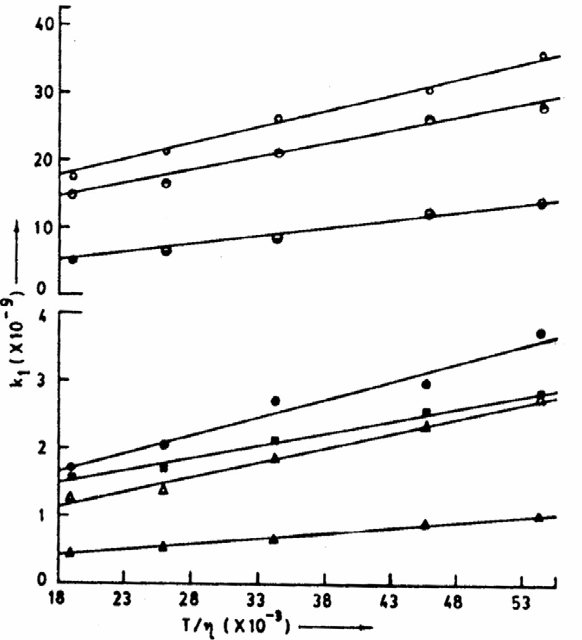 Plots of k1 vs. T/η for different experimental sets of ESPT reactions. Top to bottom represents IND-NaOH, DPA-NaOH, CAZL-NaOH, CAZL-Et2NH, CAZL-EtNH2, CAZL-Et3N and CAZL-NH3 (all are in aqueous solutions, η at different temperatures have been taken from CRC Handbook of Chemistry and Physics, 67th Edn., 1986, F-37 and F-38).