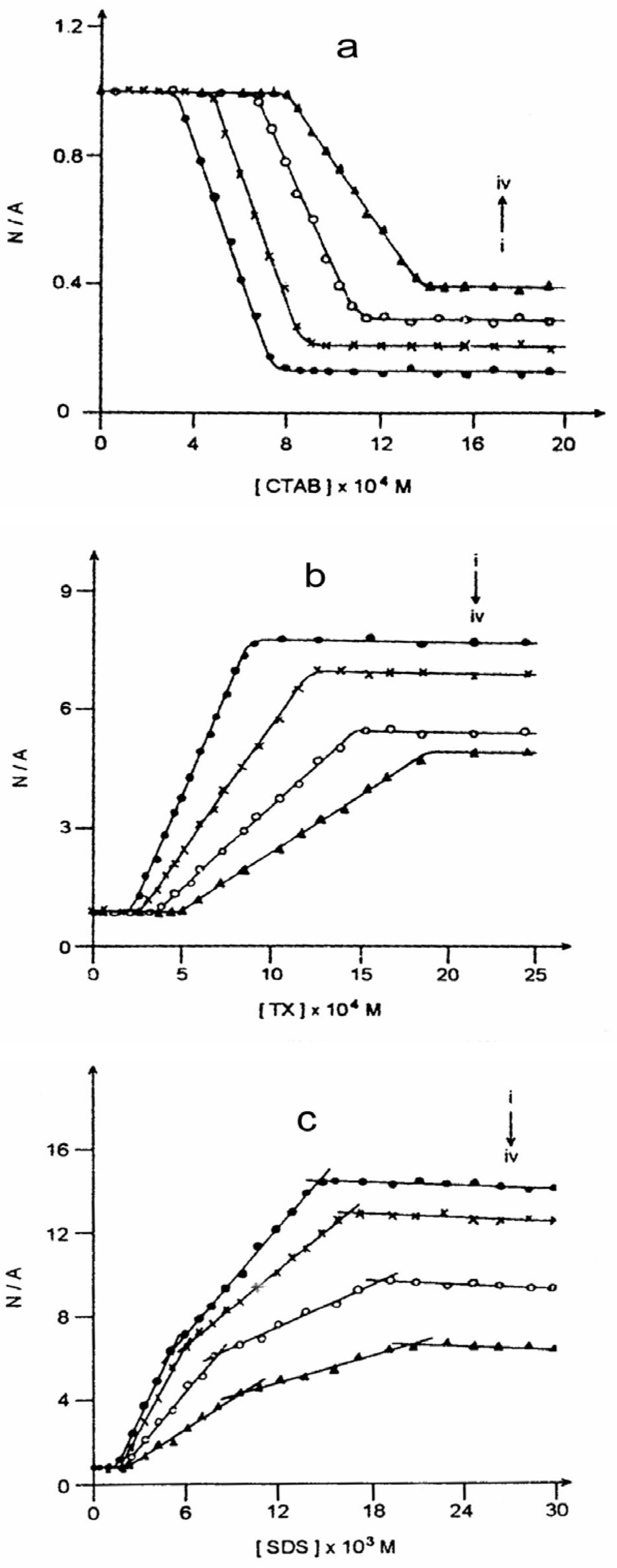 (a) Plot of neutral/anion emission yield ratio (N/A) against CTAB concentration in the presence of (i) 0.0, (ii) 1.0, (iii) 2.5 and (iv) 4.0 molar urea.(b) Plot of neutral/anion emission yield ratio (N/A) against TX concentration in the presence of (i) 0.0, (ii) 1.0, (iii) 2.5 and (iv) 4.0 molar urea.(c) Plot of neutral/anion emission yield ratio (N/A) against SDS concentration in the presence of (i) 0.0, (ii) 1.0, (iii) 2.5 and (iv) 4.0 molar urea.