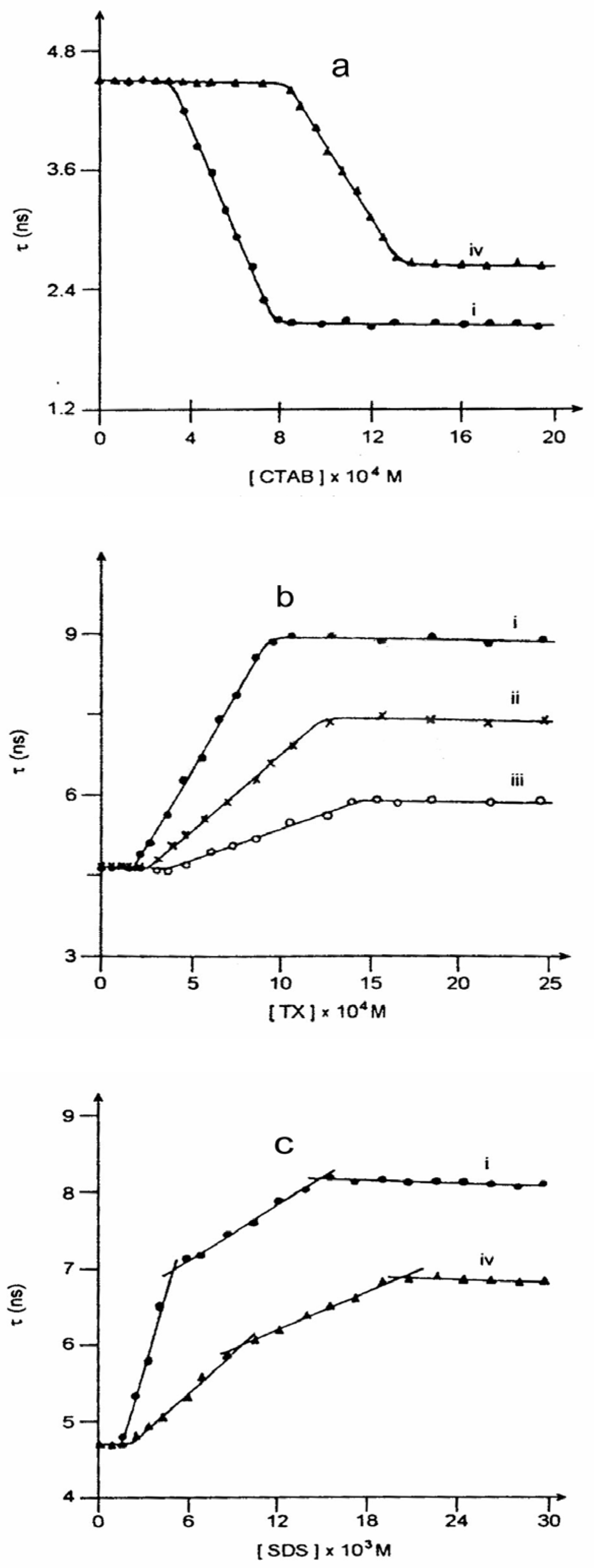 In one of our papers we reported the influence of the micellar environments, like cetyltrimethylammonium bromide (CTAB), triton-X 100 (TX) and sodium dodecyl sulphate (SDS), on the ESPT reac-tion of CAZL [22]. Taking advantage of the dual luminescence corresponding to the two prototropic species during the ESPT reaction, it is possible to determine conveniently the critical micellar concentration (CMC) of the aqueous micellar systems. Neutral/anion (N/A) emission yield ratio (for steady state study) and fluorescence lifetime of the neutral species (τ360) (for time-resolved study) are plotted against surfactant concentrations. The sharp break points, by convention, are assigned to the CMCs. Figure 5 and Figure 6 present such plots for the steady state and time-resolved studies respectively. The experiments suggest multiple CMCs for all the micellar systems. This aspect has been dealt with