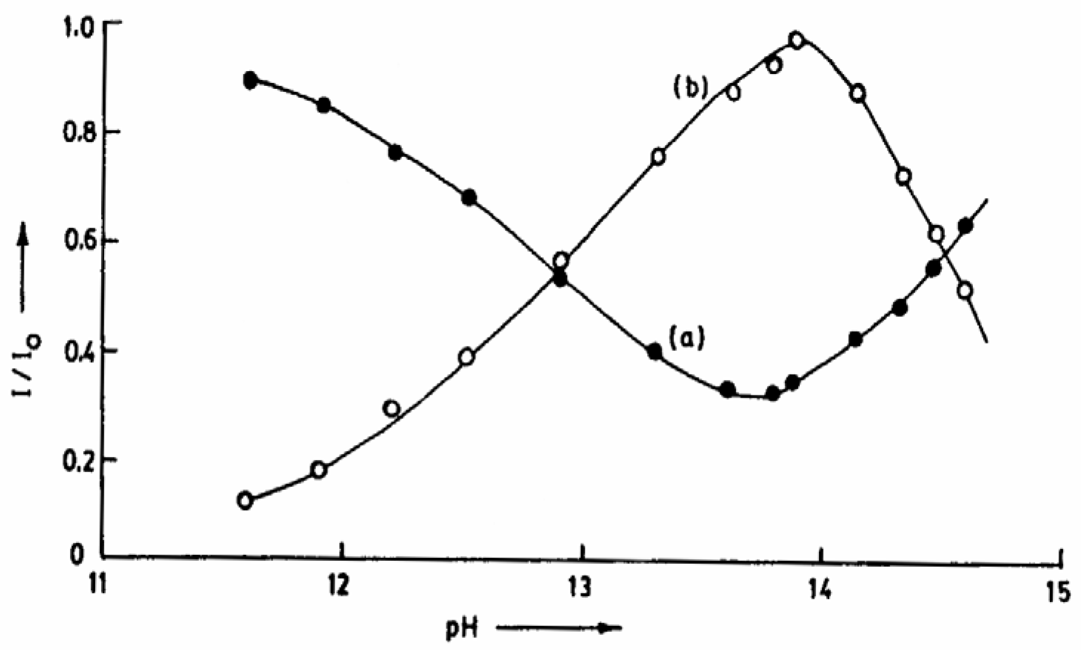 Plot of I/I0 of CAZL vs. pH of aqueous TX (5x10-4M) solution : (a) neutral and (b) anion.