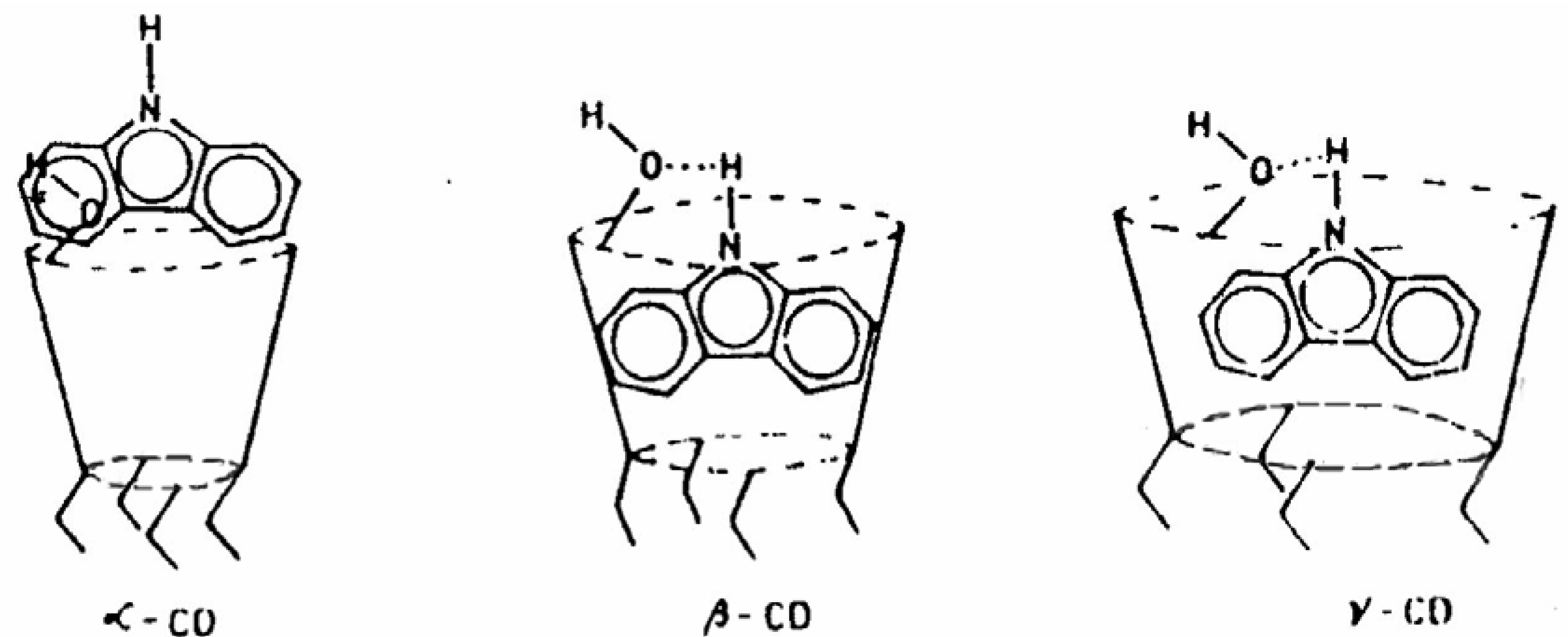Thus, whether or not the excited state prototropic process is favored depends on the CD-imposed microenvironment of the guest molecule as well as the location of the deprotonation center. Using the same CD, the deprotonation rates are found to be lowered when the deprotonating groups are ─NH2 (naphthylamines) or ─OH (naphthols), but enhanced when the group is a heterocyclic >NH (CAZL). The discrepancy between the results for CAZL and naphthylamines or naphthols is ascribed to the rigidity of the >NH site of CAZL compared with the free ─NH2 or ─OH groups. For the latter two groups of compounds, the prototropic centers are embedded within the CD cavities and hence the deprotonation process is restricted because of a less polar environment as well as less accessibility of the external base (OH¯) in such environments. The observations during study of the ESPT of CAZL in aqueous and aqueous CD environments establish that [50,25] the fluorophore sits in the rim regions of β- and γ-CD. The enhanced deprotonation has been explained by a cooperative proton transfer mechanism following the flip-flop hydrogen bonding of the alcoholic ─OH groups of CDs in the rim region [51,52,53]. The encapsulation pattern of CAZL in different CDs and the cooperative proton transfer has been schematically presented in Fig. 9. High local concentration of the alcoholic ─OH groups around the deprotonation center of CAZL facilitates the prototropic process through cooperative action [50]. The dual fluorescence of CAZL, thus, suggests the location as well as the orientation of the probe in the CD cavities.