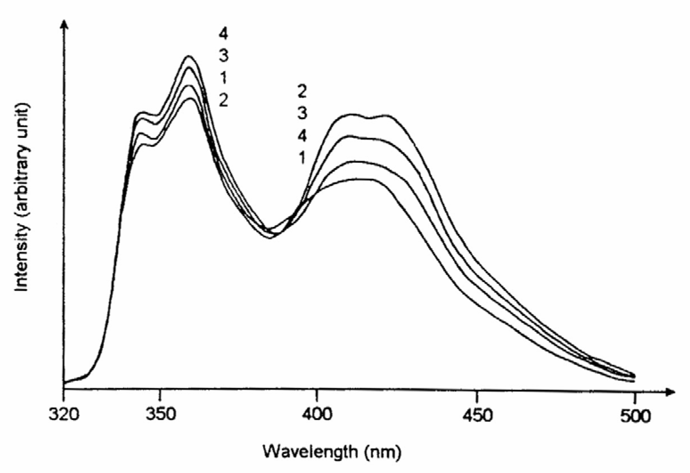 Steady state fluorescence spectra of CAZL in different aqueous environments at pH 12: (1) in water, (2) in 5mM β-CD, (3) in 5mM β-CD plus 1M urea and (4) in 5mM β-CD plus 2M urea. CAZL concentration is same in all the cases.