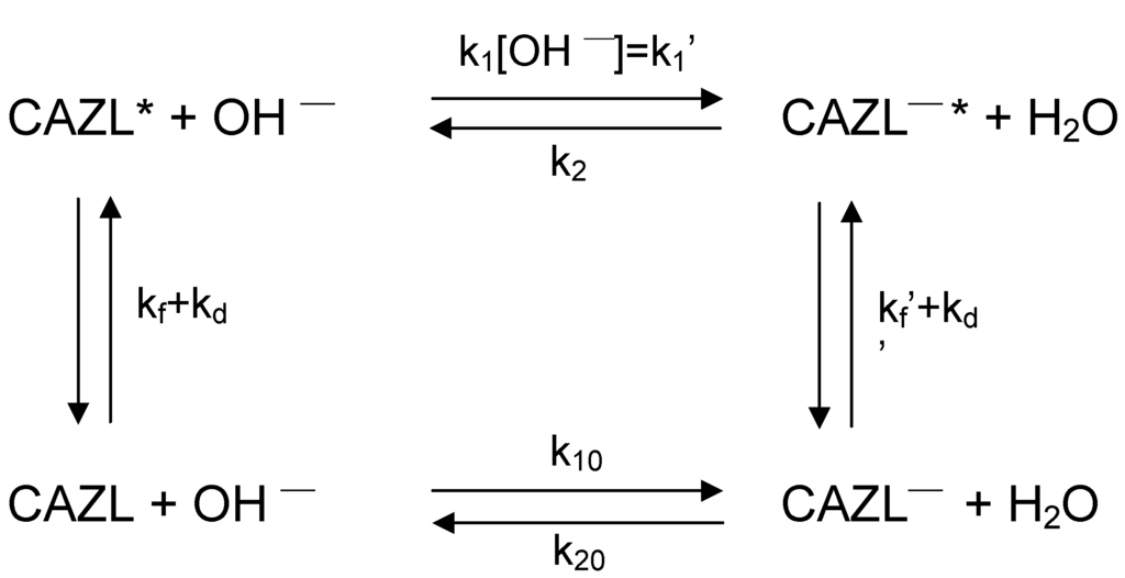 Fig. 3 shows the decay profiles of the neutral (monitored at 360 nm) and anionic species (monitored at 415 nm) of CAZL in presence of different concentrations of NaOH. The decay at 360 nm is found to be single exponential and
