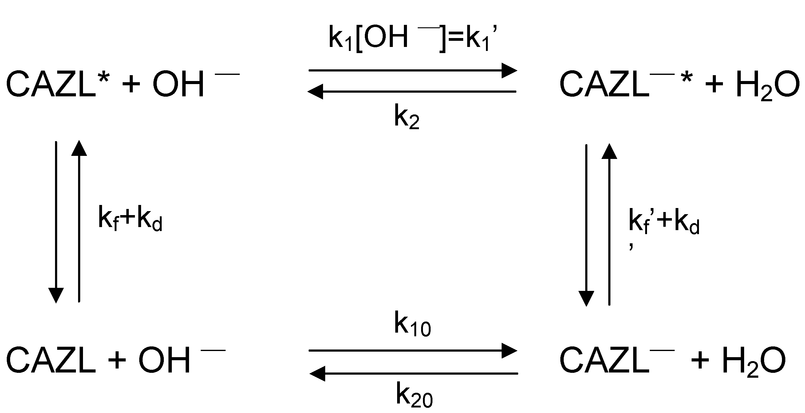 Proton transfer reaction of CAZL with various rate constants. CAZL and CAZL─ represent carbazole and the corresponding anion; the starred terms are the corresponding species in the S1 state. k1’ and k2 are the pseudo-first-order rate constants for the forward and the backward reaction in the excited state, k10 and k20 are the corresponding rate constants in the ground state, kf and kf´ are the rate constants for fluorescence of carbazole and the anion respectively, kd and kd´ are the respective non-radiative constants.
