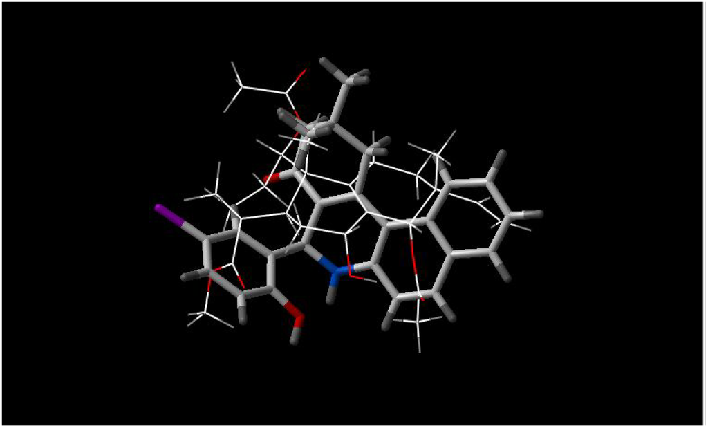 In Figure 6 and Figure 7, similarities between epigallocatechin-3-O-gallate (EGG) and two Influx compounds are depicted. However, EGG is not a potentiator of drugs in bacterial MDR processes, and possibly is therefore not an inhibitor of bacterial MDR efflux. This can possibly be explained by visually examining the best fit between EGG and the two Influx compounds (INF271 and INF277). The similarity index is very high for both of these combinations but it can be observed that there is a poor fit between EGG and the aromatic moieties of both of these compounds. Looking at the fit between INF277 and the diterpene from Lycopus europaeus, there is a high calculated similarity but again this diterpene is not a potentiator of MDR drugs and this is probably due to the poor fit that this has with aromatic moieties of other MDR inhibitors e.g. INF277 (Figure 8).