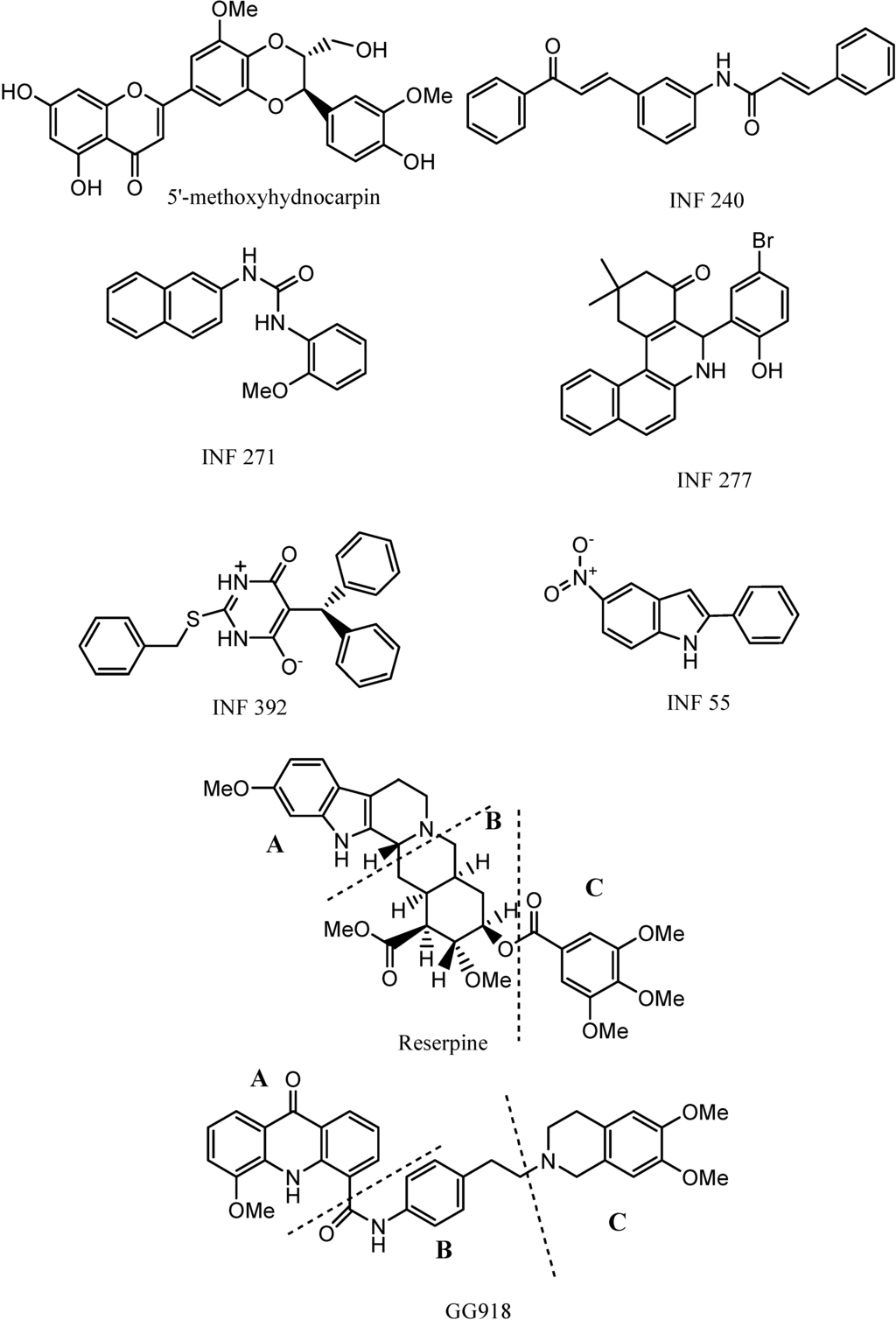 - 5'-methoxyhydnocarpin and INF 240 have the same shape and some polar groups in a similar position (Figure 1). Note the absence of nitrogen atom in 5’-MHC;