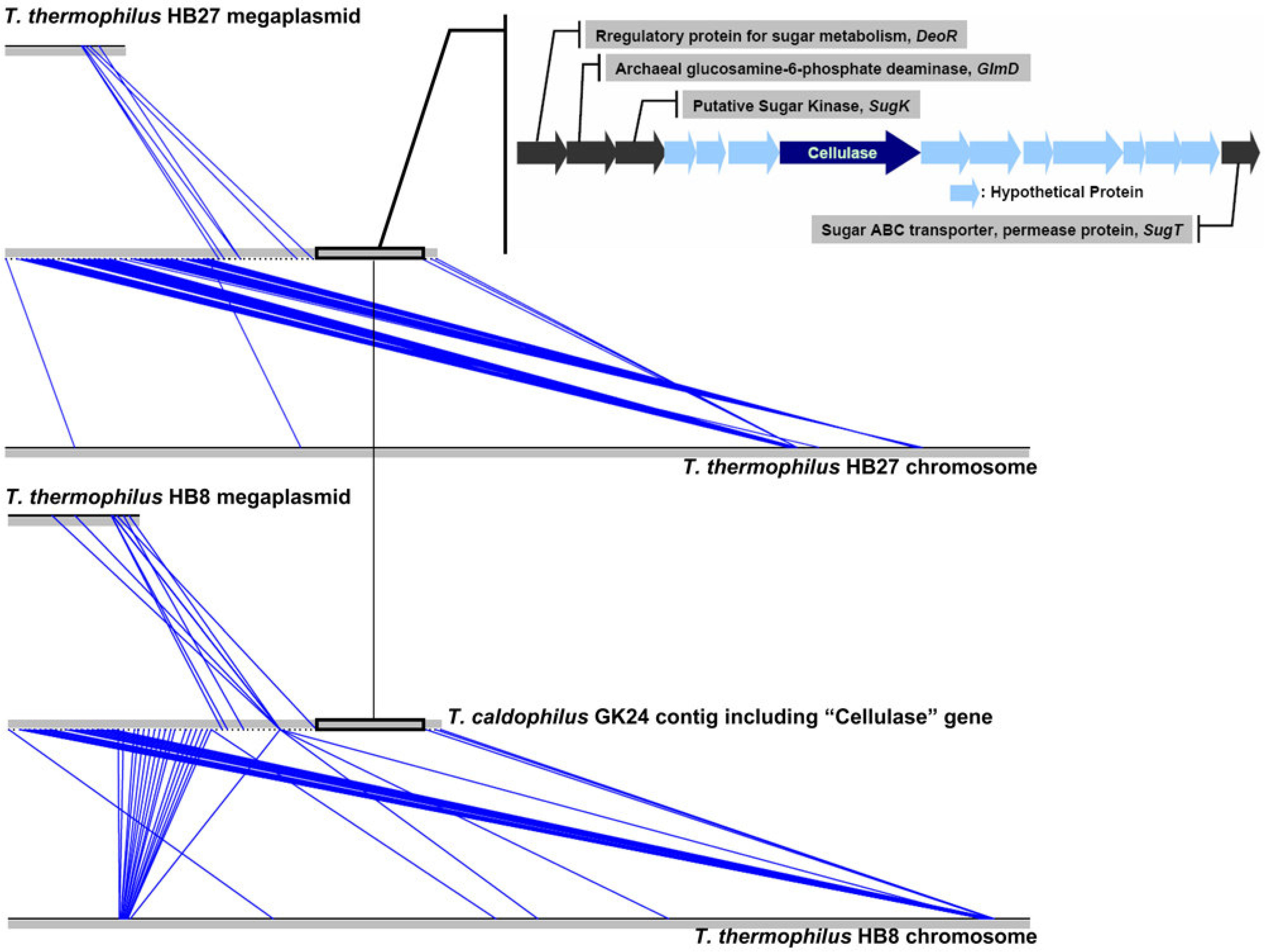 Linear comparison of the genomes of (A) T. thermophilus HB27 and T. caldophilus GK24 and (B) T. thermophilus HB8 and T. caldophilus GK24. The blue lines represent similar protein sequences (BLASTP search, > 60% similarity) between organisms. Gene organization in the 13.7 kbp region, including TcCel5A (blue arrow), of the T. caldophilus GK24 genome. Arrows indicate open reading frames, and their predicted translation products are indicated above the arrows. Black arrows indicate open reading frames of previously characterized genes (deoR, glmD, sugK, and sugT). Blue arrows indicate uncharacterized open reading frames found in the genome of T. caldophilus GK24.