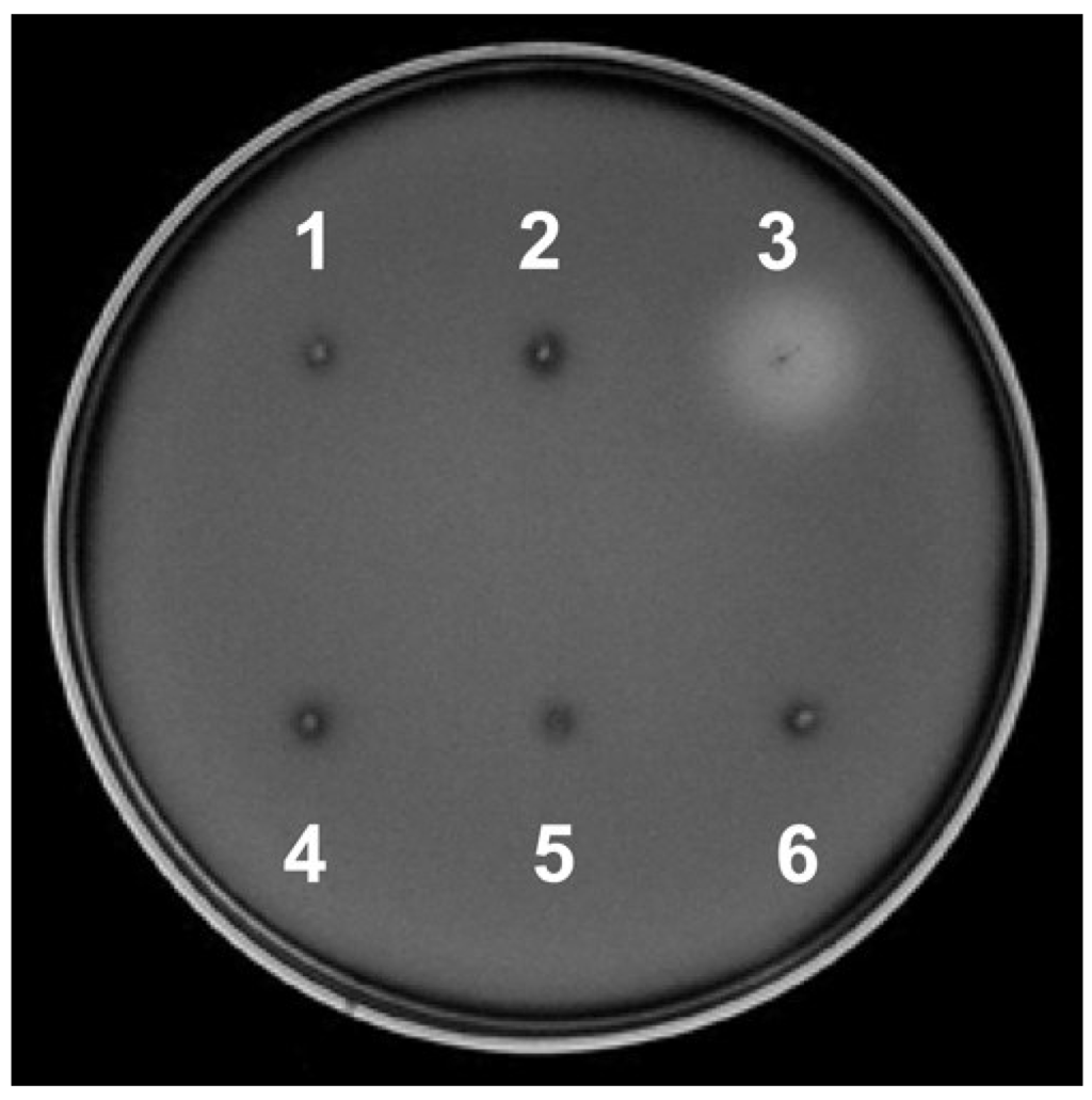 Detection of endocellulase activity in several Thermus strains. Cells were incubated on 0.1% CMC agar plates at 70°C for 40 h. 1, T. thermophilus HB27; 2, T. thermophilus HB8; 3, T. caldophilus GK24; 4, T. filiformis; 5, T. aquaticus YT1; 6, T. flavus AT62.